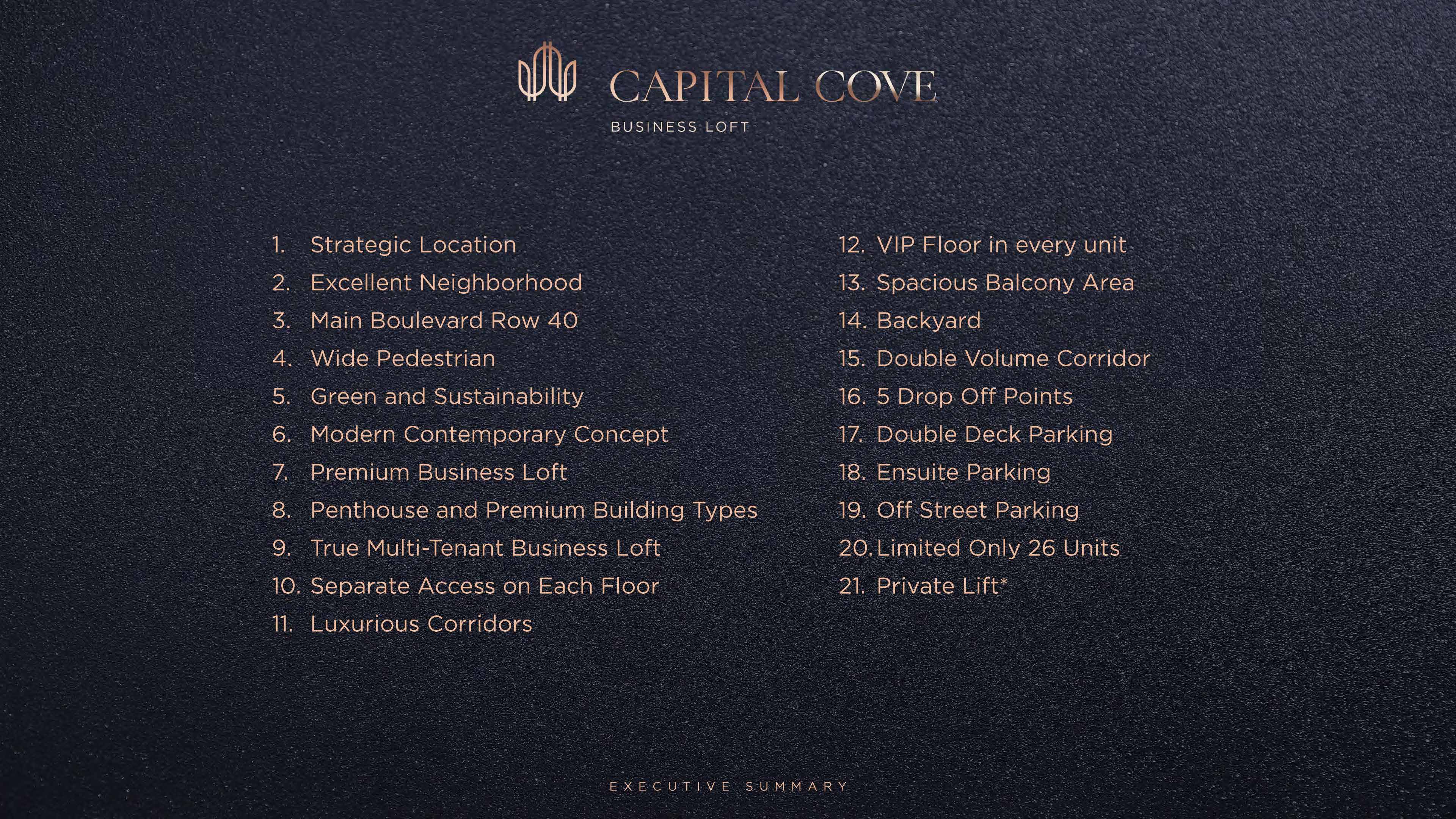 Capital Cove Business Loft BSD juga memiliki management ruangan yang elegan dan inovatif yakni memisahkan ruangan kerja dan koridor umum. Dengan konsep True Multi Tenant Business Loft, setiap lantainya didesain supaya melindungi privasi dan tidak mengganggu tenant dibawahnya. Menjadikan Capital Cove dapat disewakan ke beberapa tenant berbeda.