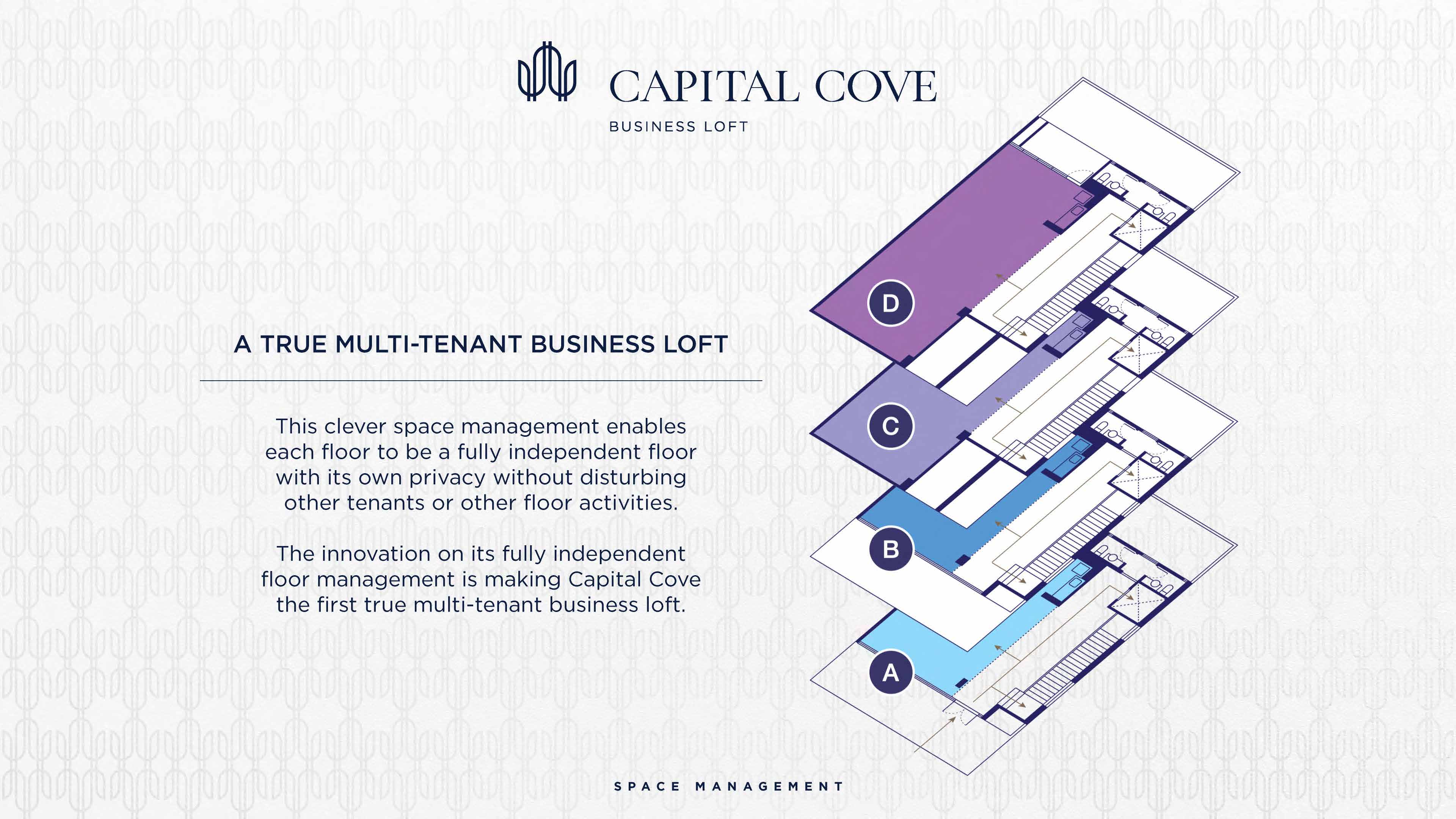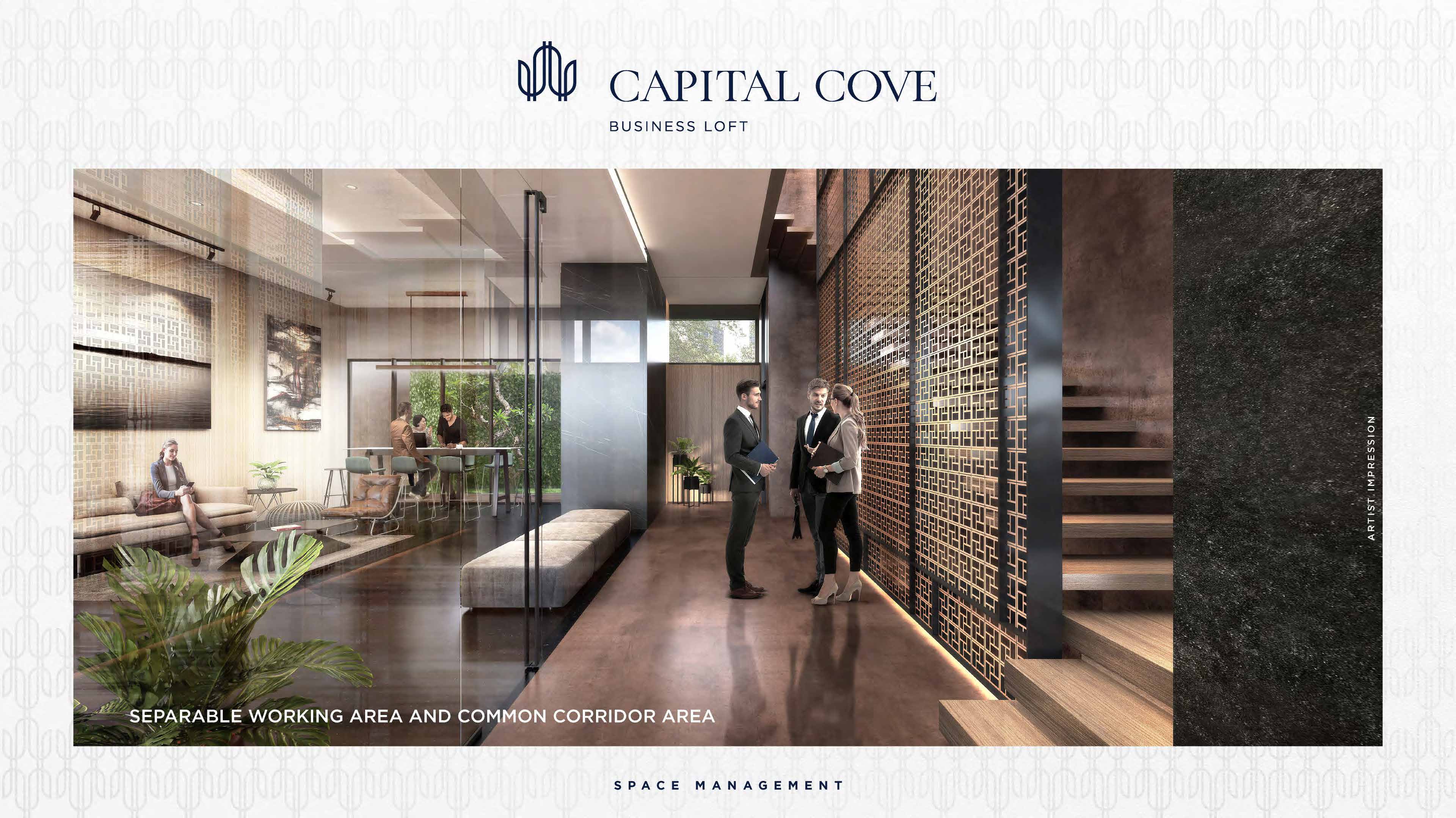 Capital Cove Business Loft BSD juga memiliki management ruangan yang elegan dan inovatif yakni memisahkan ruangan kerja dan koridor umum. Dengan konsep True Multi Tenant Business Loft, setiap lantainya didesain supaya melindungi privasi dan tidak mengganggu tenant dibawahnya. Menjadikan Capital Cove dapat disewakan ke beberapa tenant berbeda.