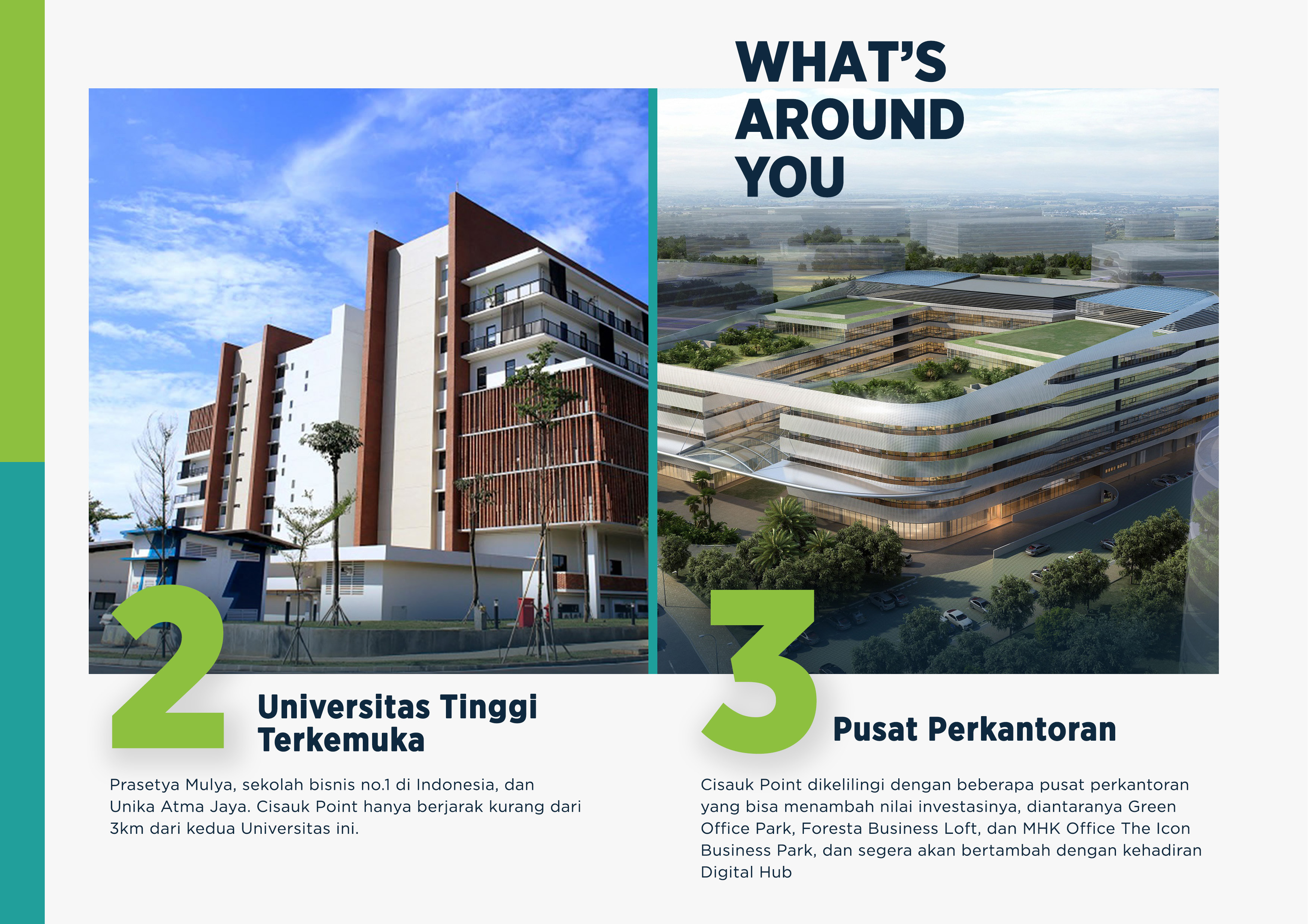 Dekat dengan pusat perkantoran Green Office Park, Foresta Business Loft, dan MHK Office The Icon, serta segera bertambah dengan kehadiran Digital Hub. Lokasi juga berdekatan dengan universitas ternama seperti Prasetya Mulya dan Unika Atma Jaya. Lengkap dengan commercial area yang terintegrasi ke Stasiun KRL Cisauk.
