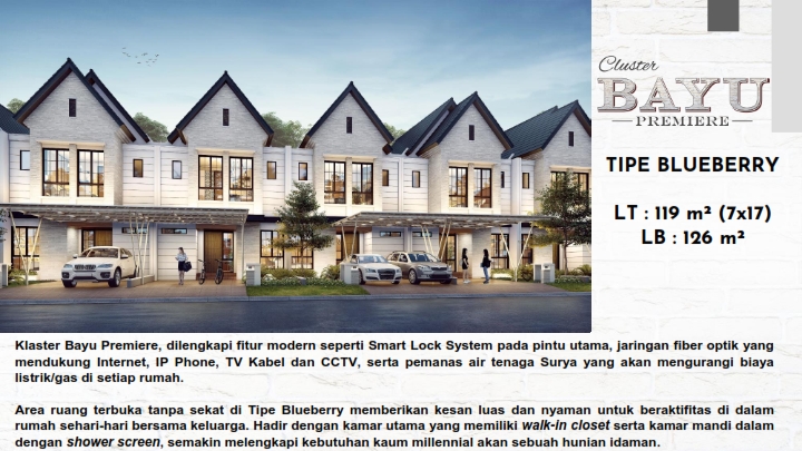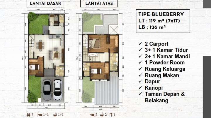 1. Type Blueberry (LT 119m² (7×17), LB 126 m²), 3+1 kamar tidur, 3+1 kamar mandi dan 2 Carport