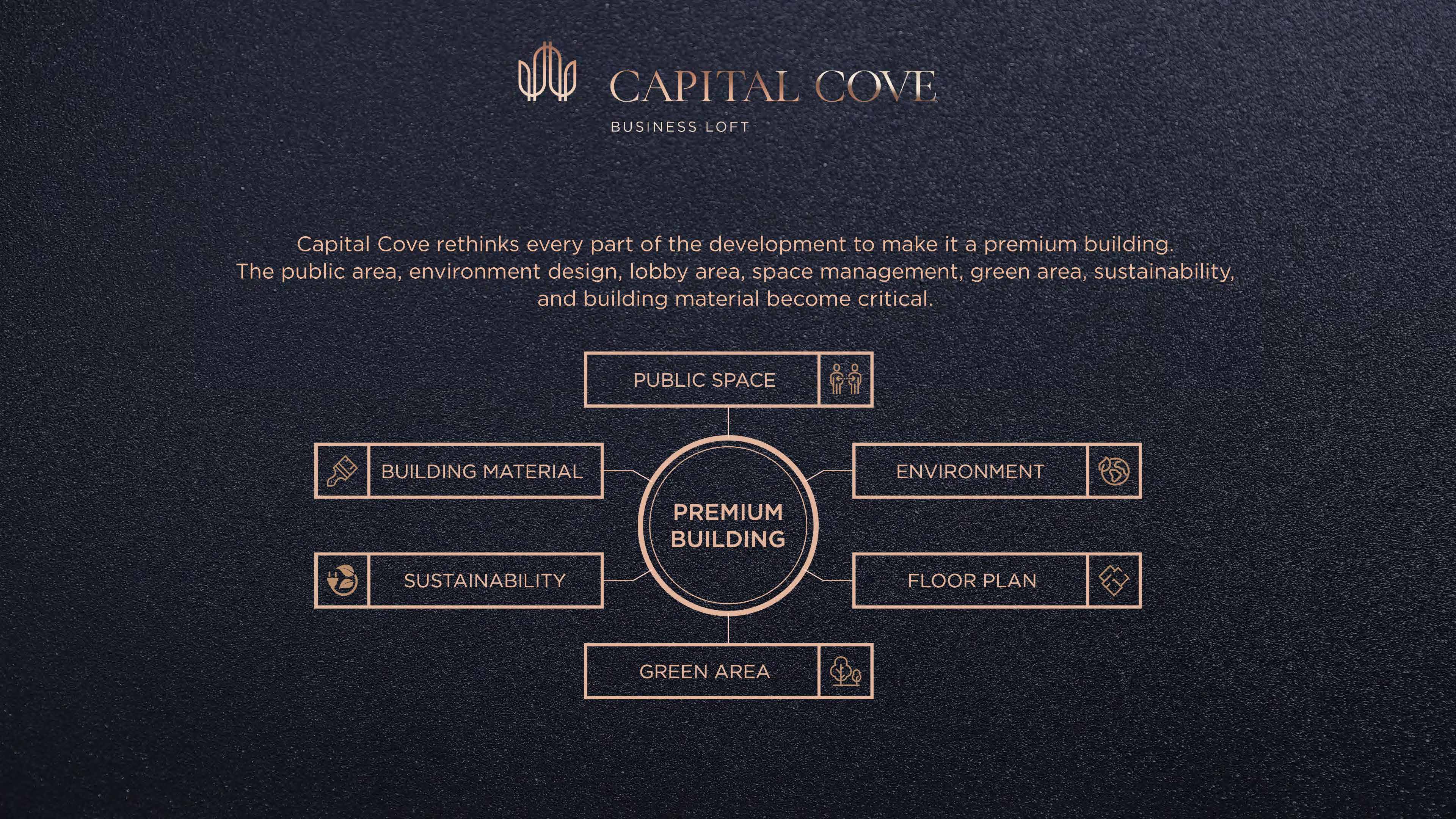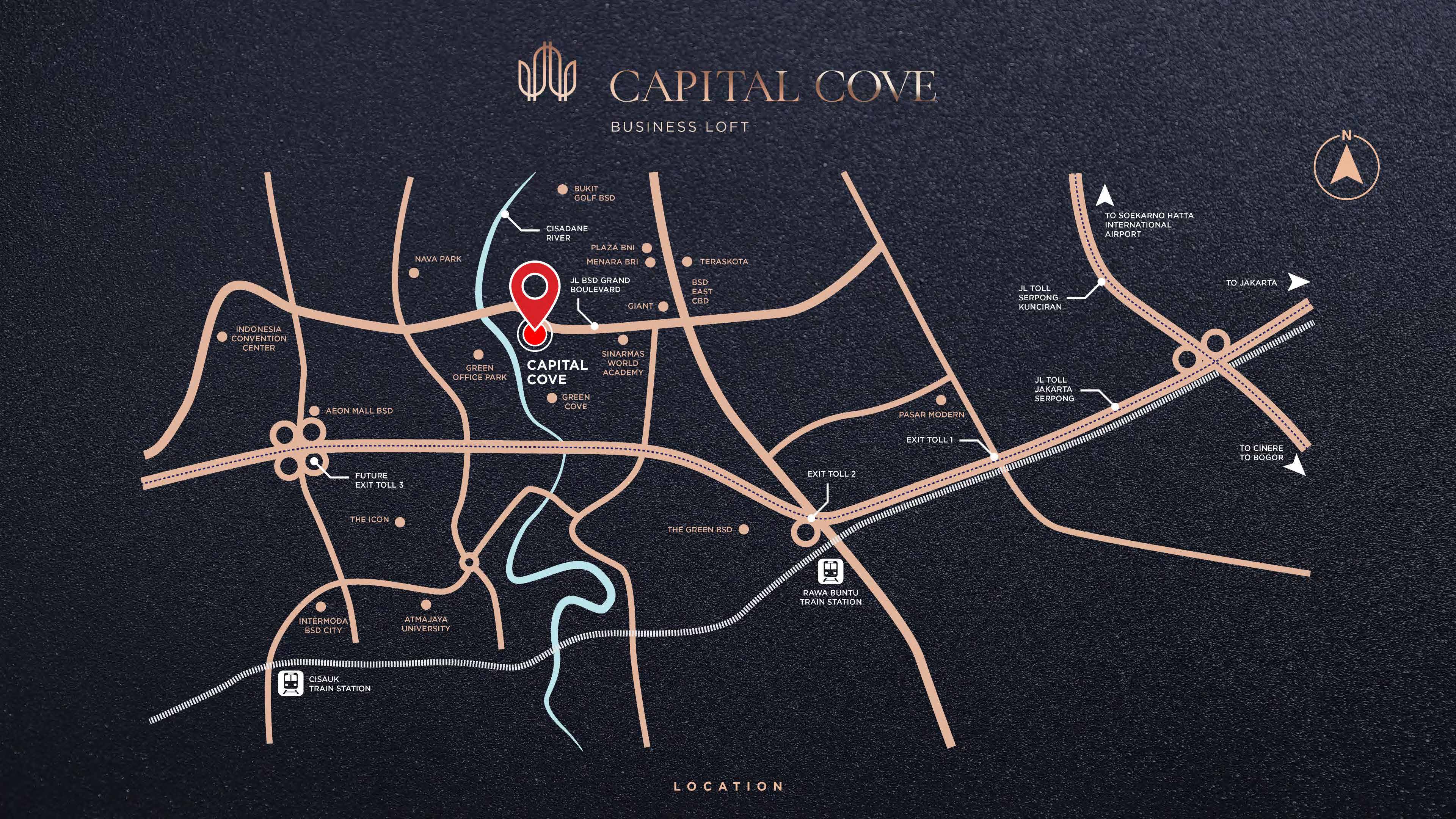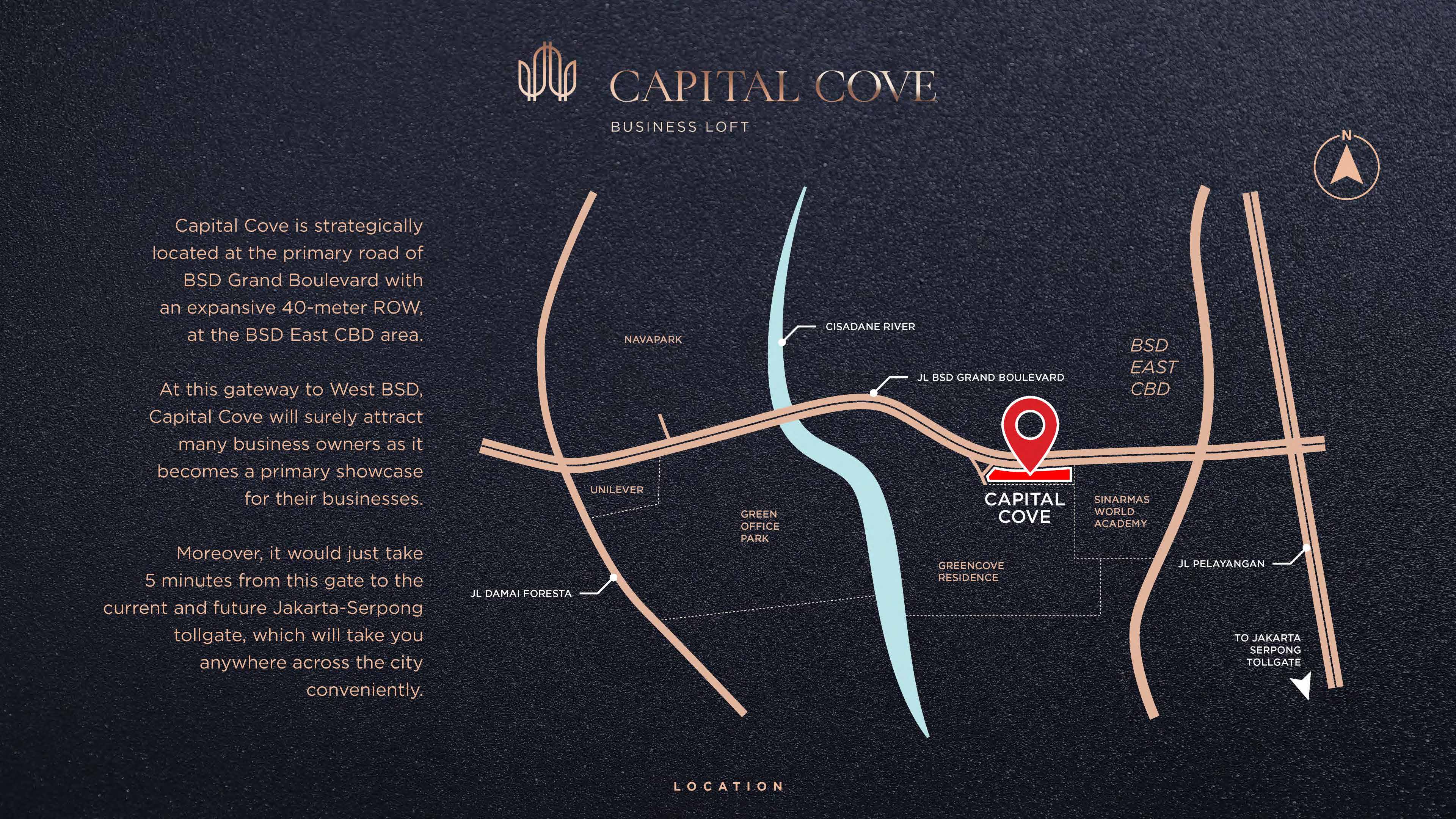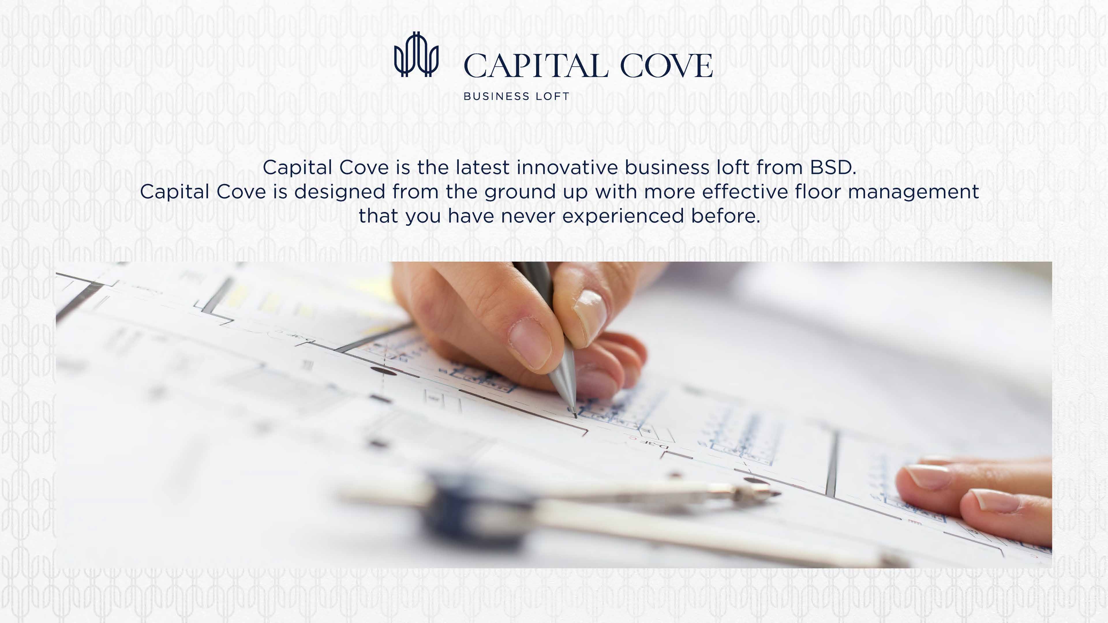 Capital Cove @ BSD City adalah gedung perkantoran baru yang terletak di CBD Timur BSD City, Tangerang. Dengan konsep “True Multi Tenancy”, menghadirkan space management yang belum pernah anda lihat sebelumnya. Berlokasi Strategis, hanya 5 menit ke toll Jakarta-Serpong.