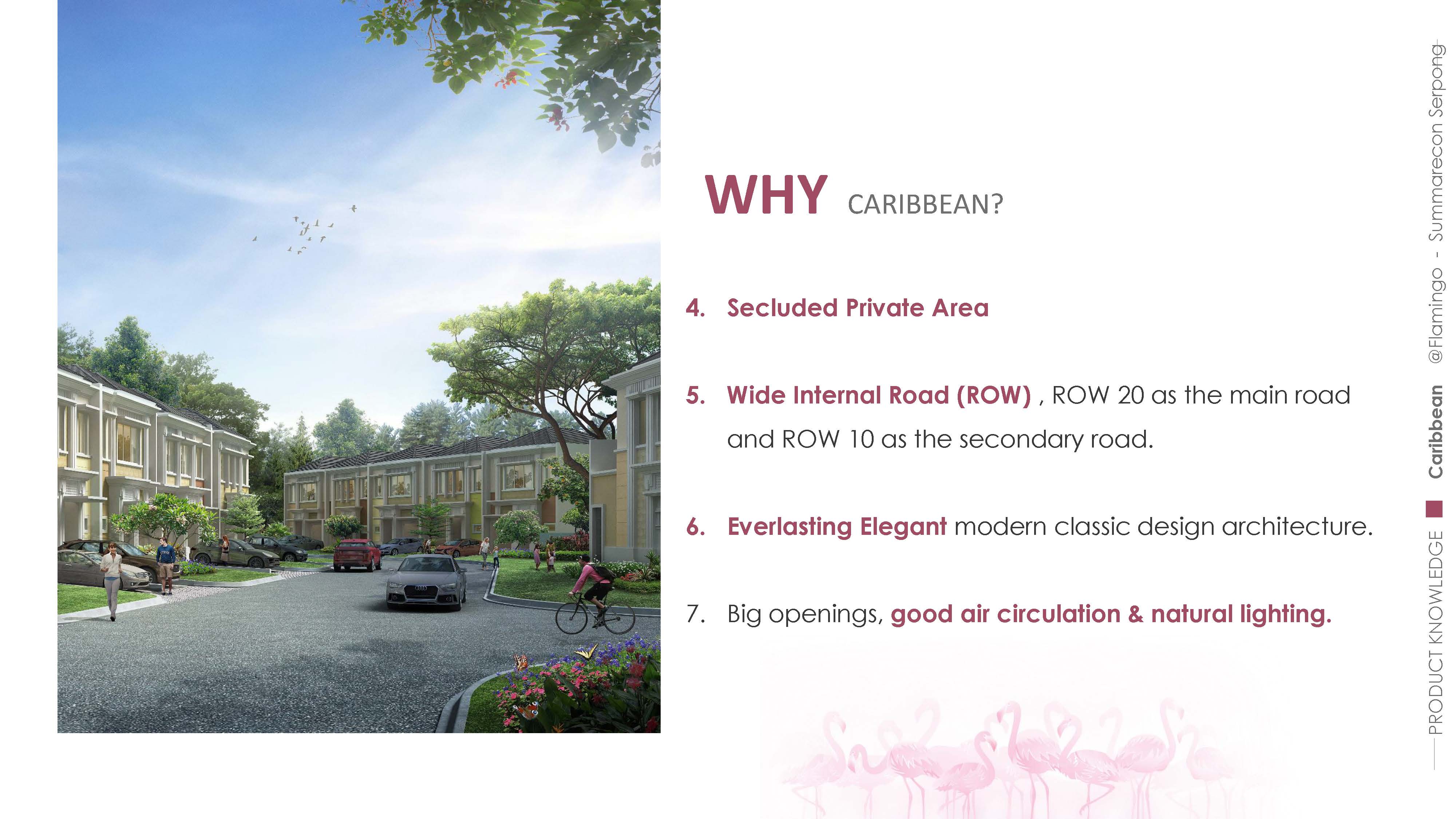 Cluster Caribbean adalah cluster hunian yang terletak di Flamingo hasil pengembangan developer ternama, Summarecon Serpong. Menghadirkan hunian modern dan ekslusif. Sebagai cluster hunian dengan fasilitas terlengkap, Carribean dilengkapi dengan cluster single gate system dengan security 24/7.