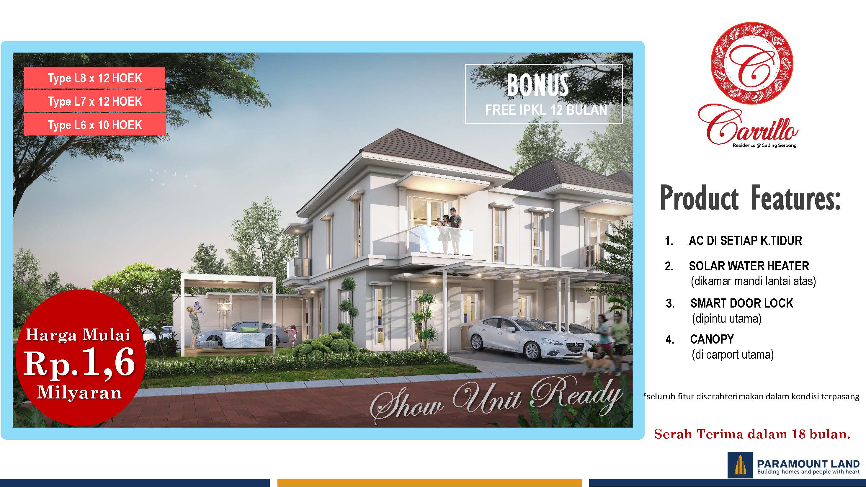 Carrilo Residence @Gading Serpong, sebuah hunian berkonsep Rumah Kembang hasil persembahan Paramount Land yang kini banyak diminati karena berdesain modern dan minimalis. Berada di lingkungan yang asri, dekat dengan perkotaan dan berbagai fasilitas yang sangat lengkap. Menjadikan Carrilo Residence sangat cocok untuk anda.