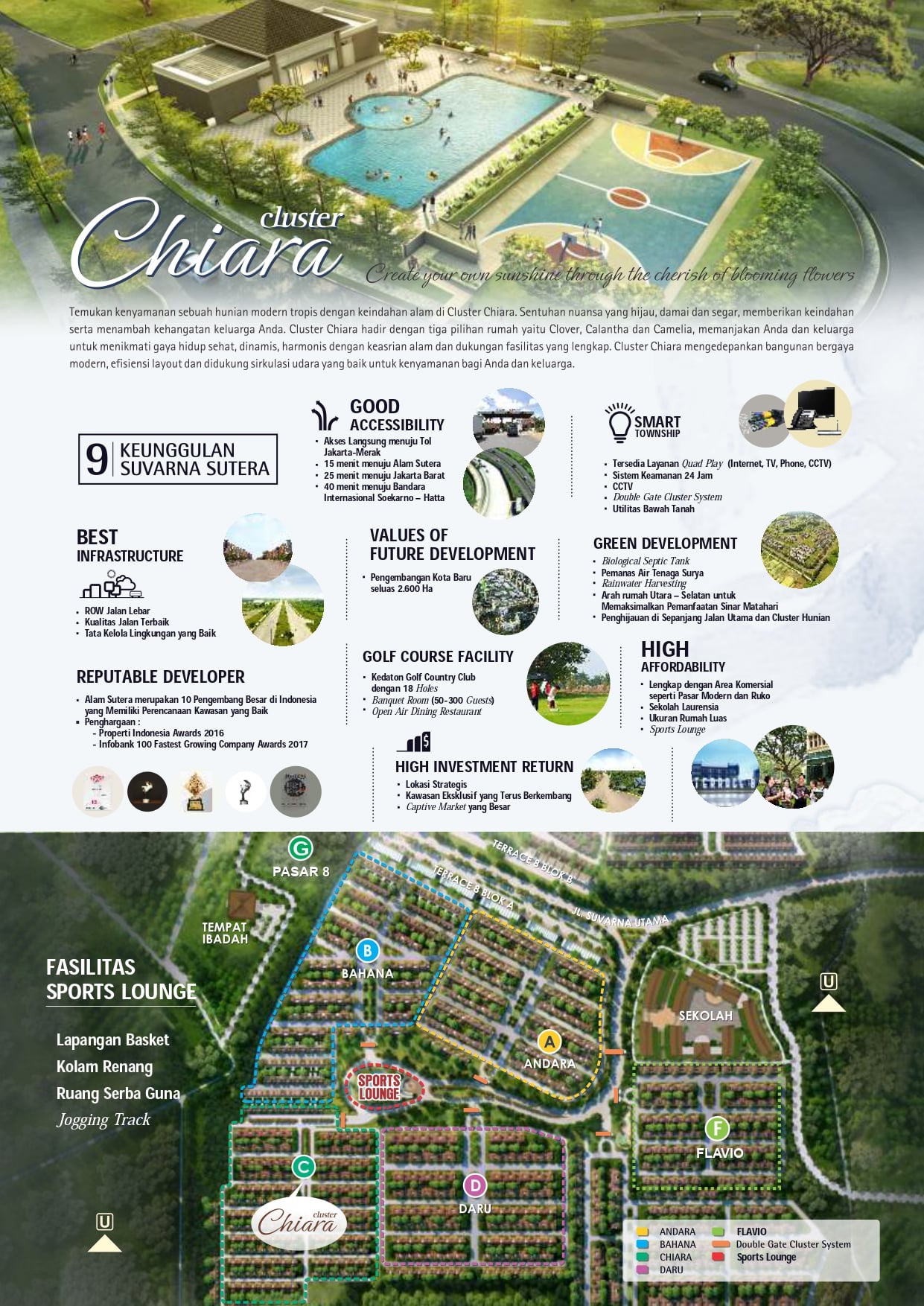 Alam Sutera Group melalui anak perusahaannya PT Delta Mega Persada kembali mempersembahkan Cluster Chiara, cluster terbaru di Superklaster Sari – Suvarna Sutera. Cluster Chiara mengedepankan bangunan bergaya modern, efisiensi layout dan didukung sirkulasi udara yang baik untuk kenyamanan bagi Anda dan keluarga. Harga mulai dari Rp 1 M-an