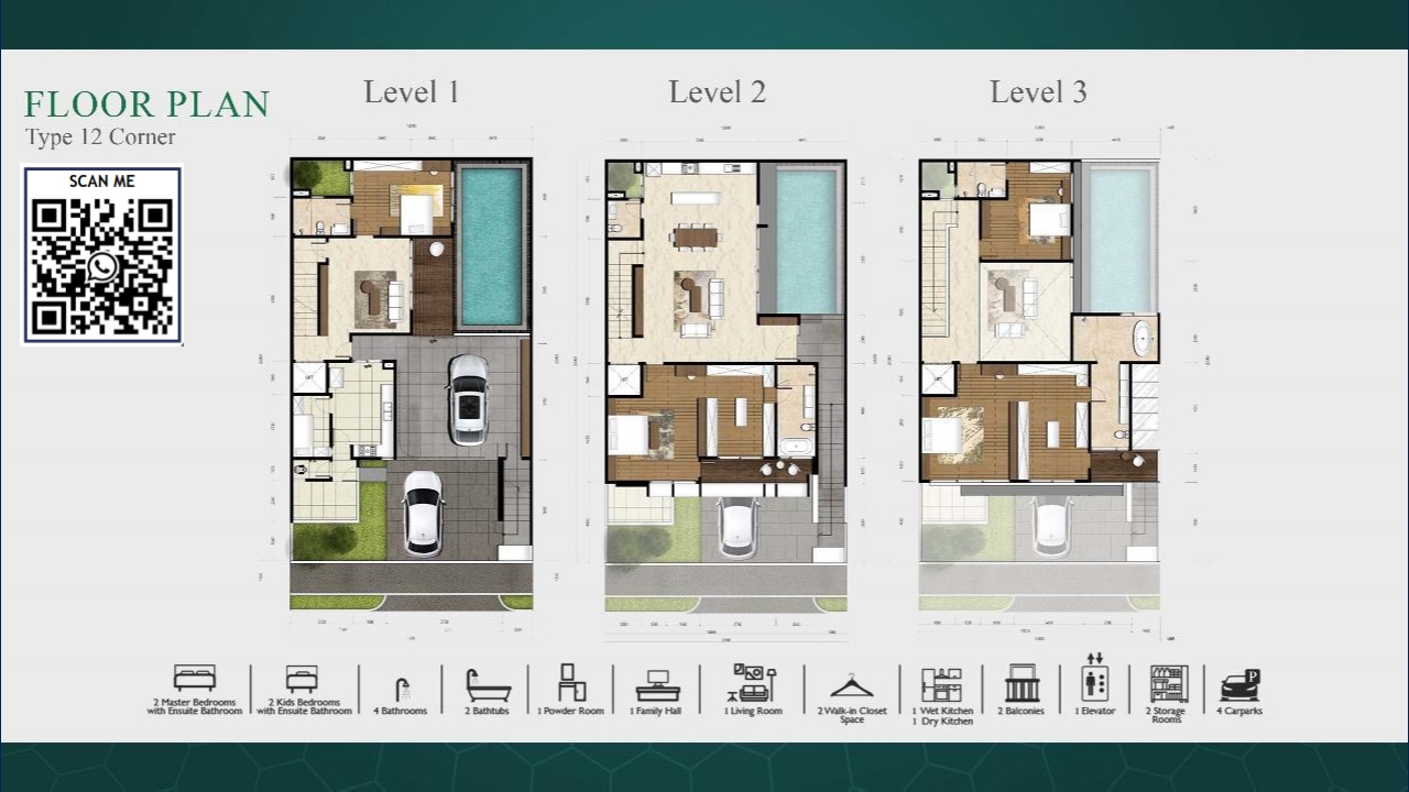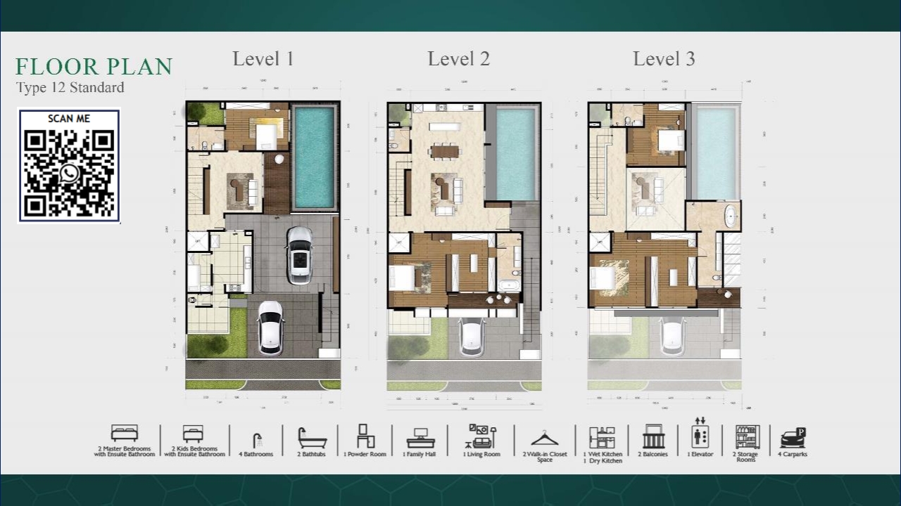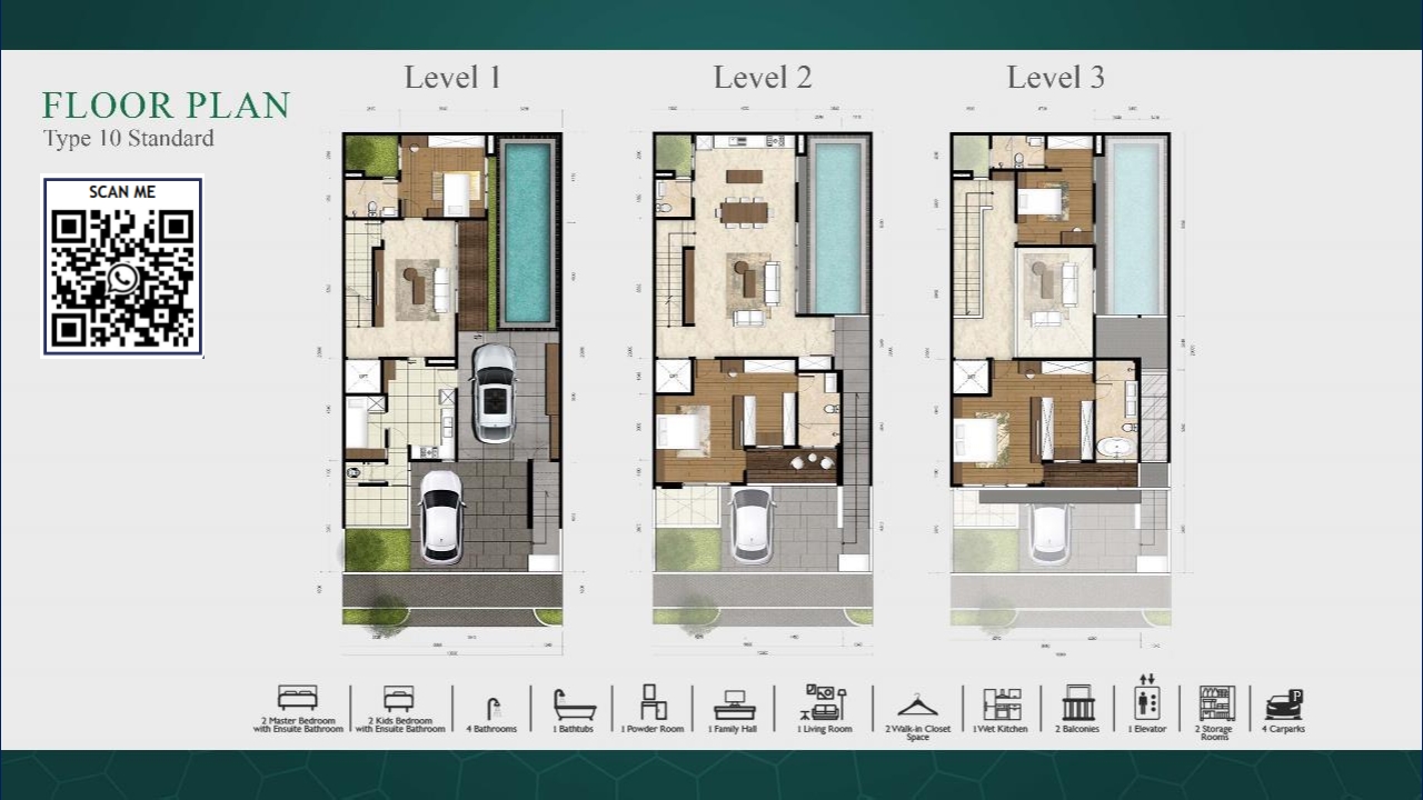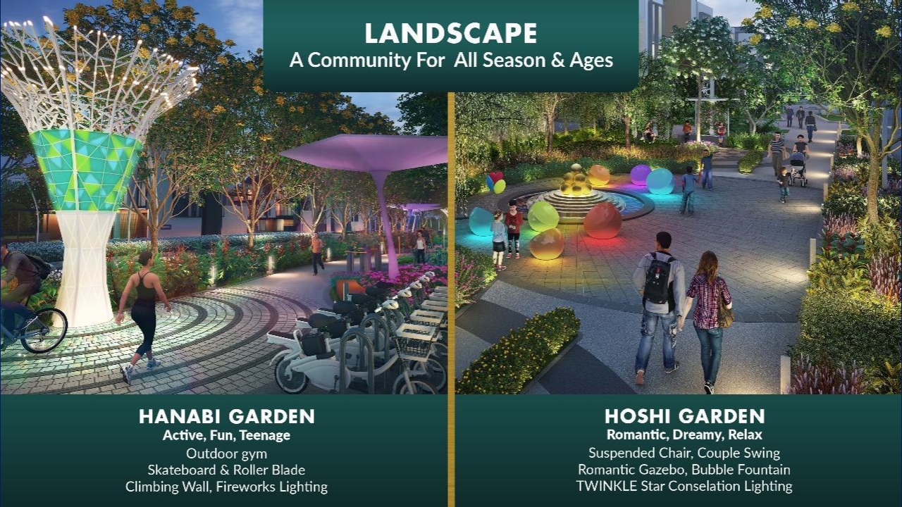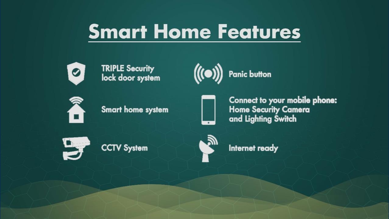 - SMART HOME Features dengan triple security lock door system, smart home system, CCTV system, panic button, connect to your mobile phone: home security camera & lighting switch, internet ready.