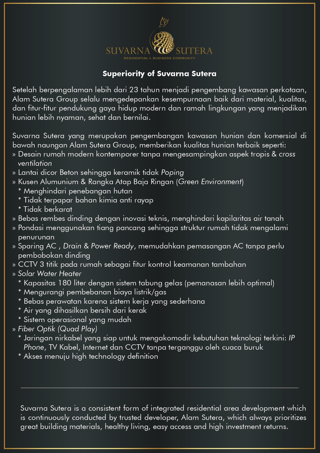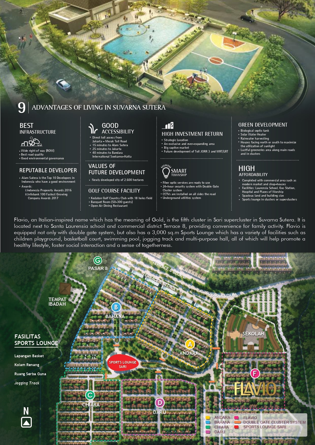 Suvarna Sutera merupakan project terbaru dari Alam Sutera Group. Dengan keseluruhan lahan seluas 2600 Ha. Saat ini pembangunan Suvarna Sutera berada pada tahap pertama dengan lahan pengembangan seluas 900 Ha. Dibangun sebagai hunian dengan konsep alam yang asri, Suvarna menghadirkan berbagai cluster salah satunya adalah Cluster Flavio.