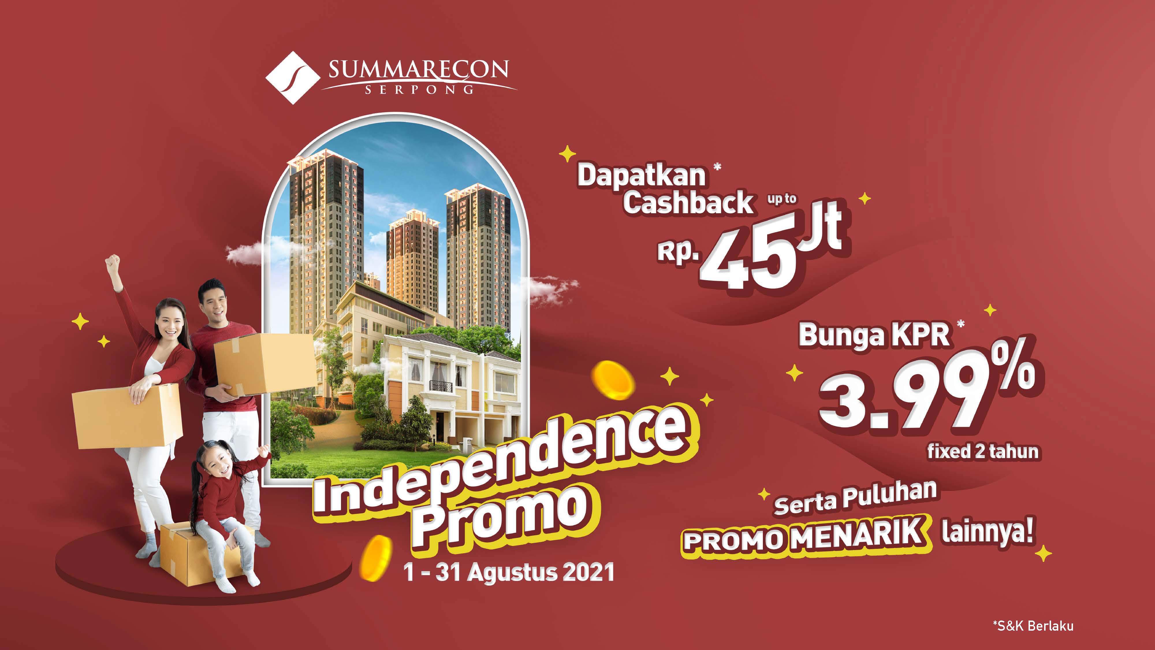 Independence Promo dari Summarecon Serpong berlangsung dari tanggal 1-31 Agustus 2021. Promo ini meliputi banyak properti hasil pengembangan Summarecon Serpong. Dapatkan Cashback Up To Rp 45 Juta dan Bunga KPR 3.99% Fixed 2 Tahun*.