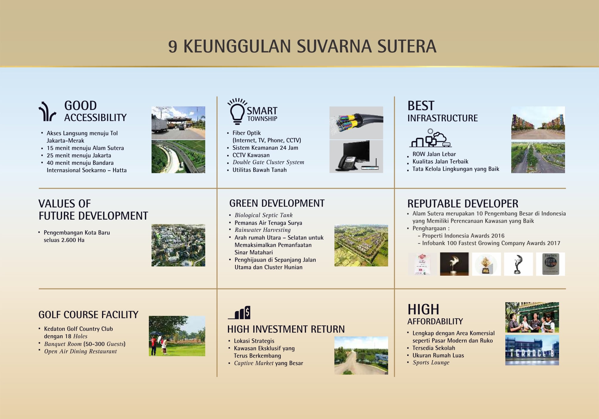 Suvarna Sutera merupakan project terbaru dari Alam Sutera Group. Dengan keseluruhan lahan seluas 2600 Ha. Saat ini pembangunan Suvarna Sutera berada pada tahap pertama dengan lahan pengembangan seluas 900 Ha. Dibangun sebagai hunian dengan konsep alam yang asri, Suvarna menghadirkan berbagai cluster.