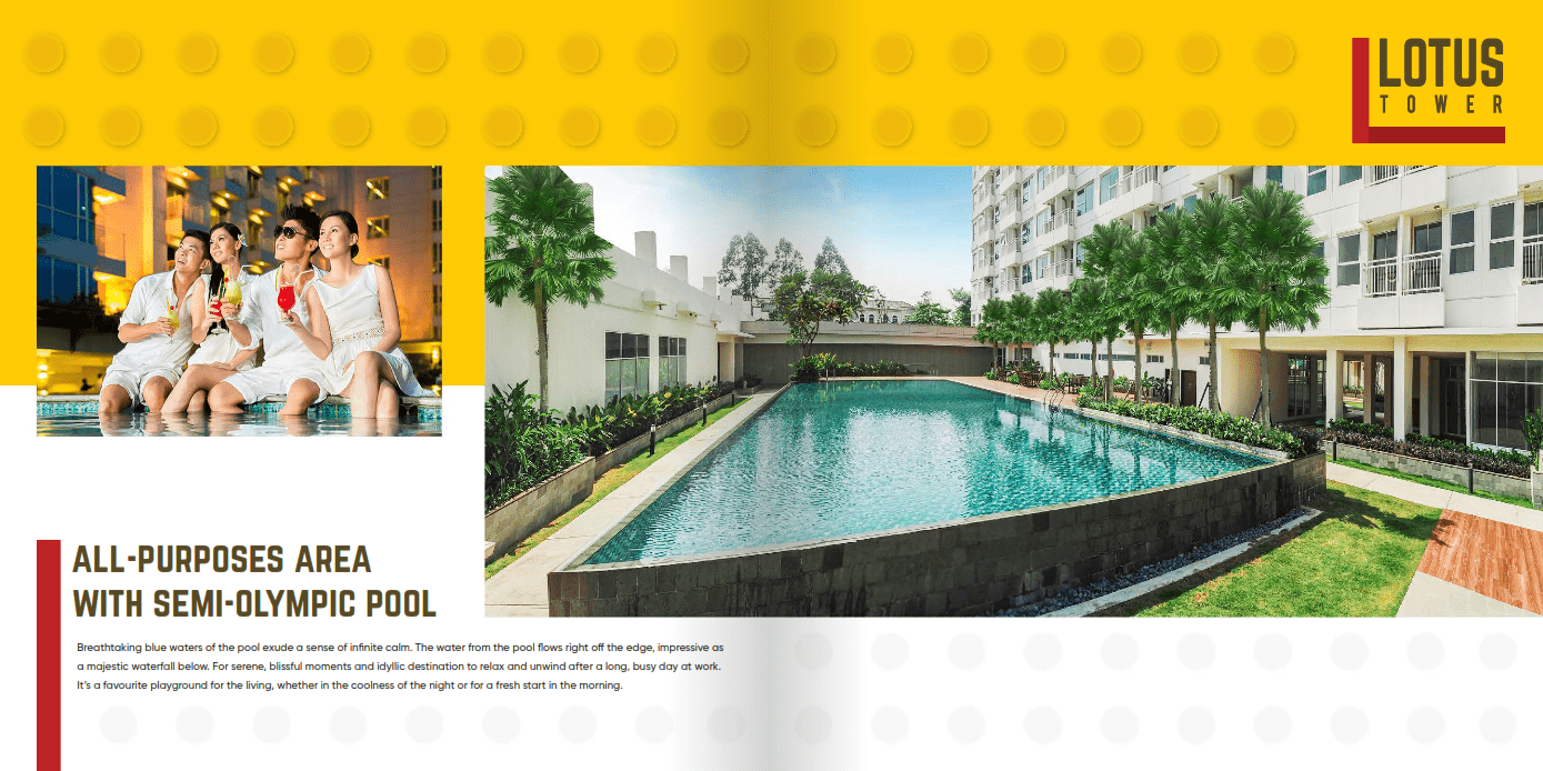 Apartment Tower Lotus dilengkapi berbagai fasilitas yang menunjang gaya hidup pemiliknya, seperti jogging track, kolam renang Semi-Olympic, kolam anak-anak, gym, apotek, spa, taman bermain, restoran dan banyak lagi.