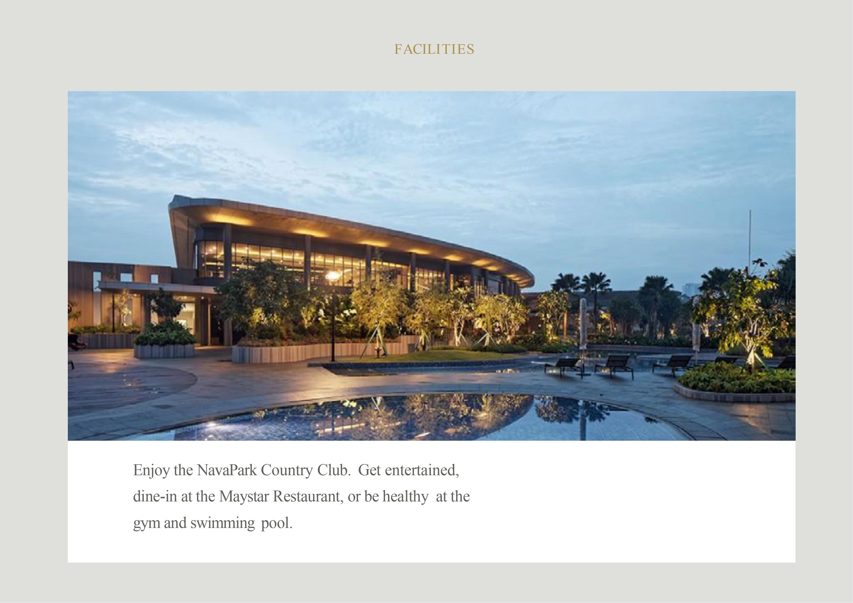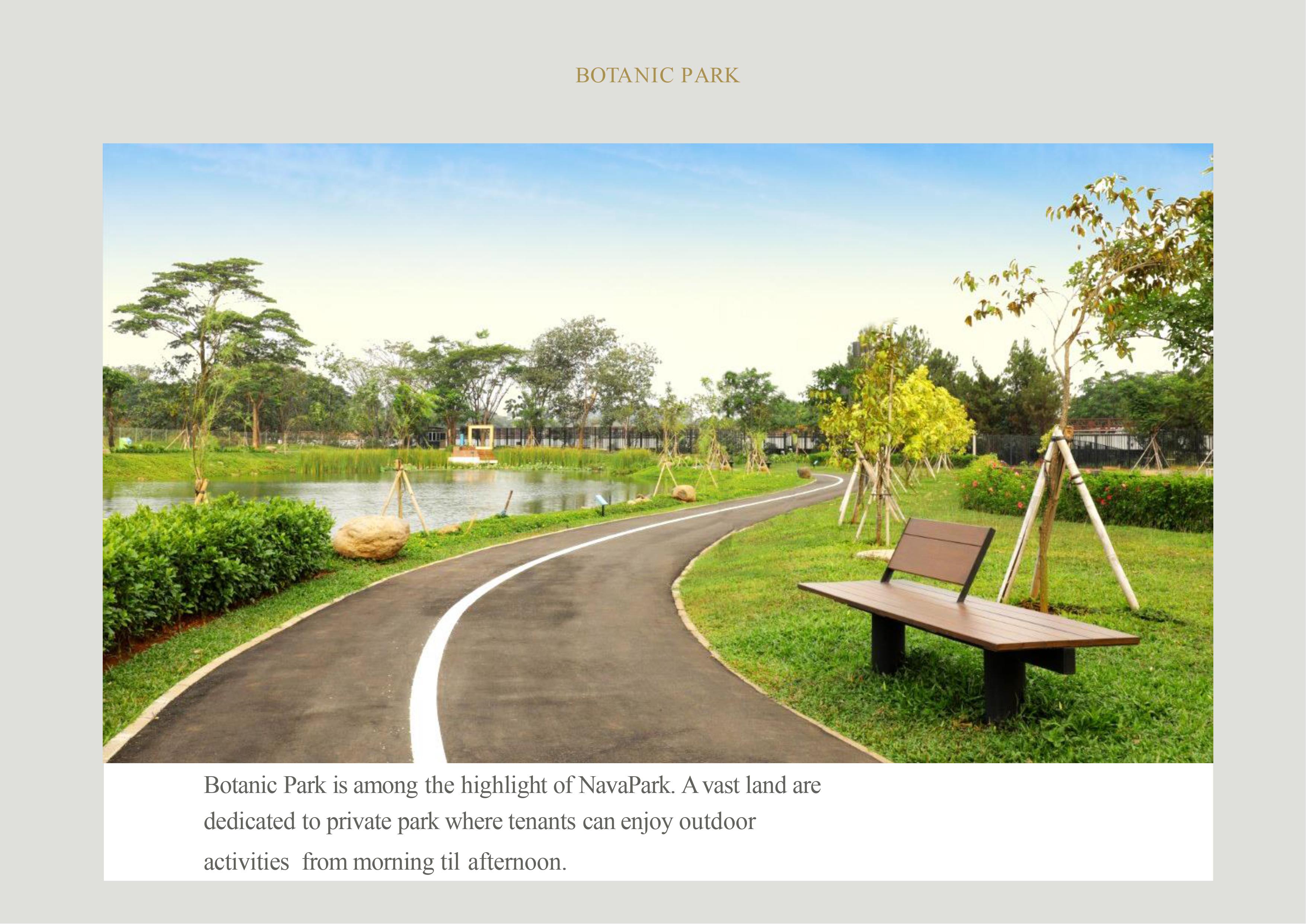 Terdapat pula joging track, private akses ke Botanical Park NavaPark.