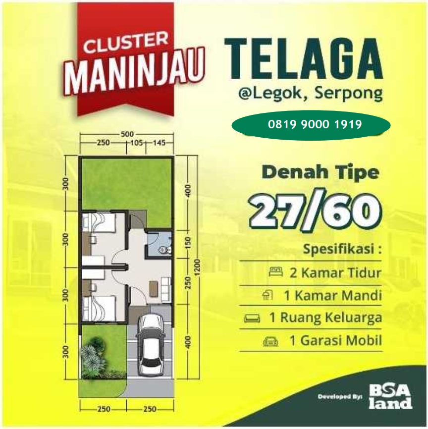 Tersedia Tipe 27/60, 2 Kamar Tidur, 1 Kamar Mandi, 1 Ruang Keluarga, dan garasi.