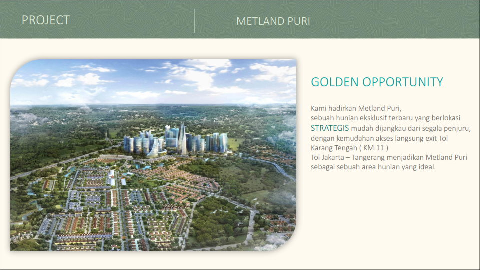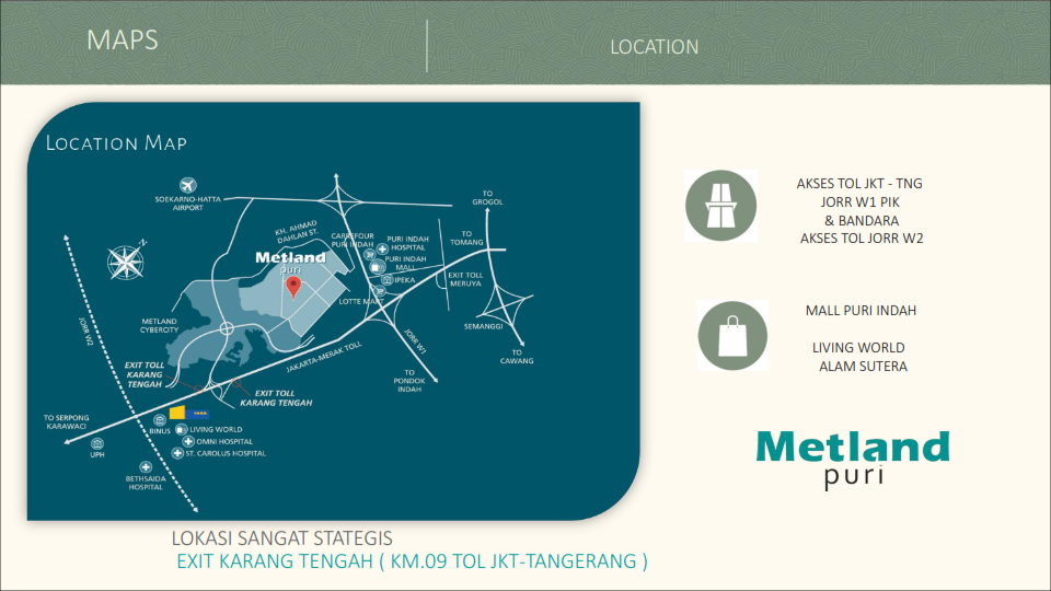 Oxalis Metland Puri berada di lokasi sangat strategis yaitu di Karang Tengah exit tol KM 11, sehingga bagi yang mencari rumah yang menempel dengan Jakarta, Metland menjadi pilihan terbaik
