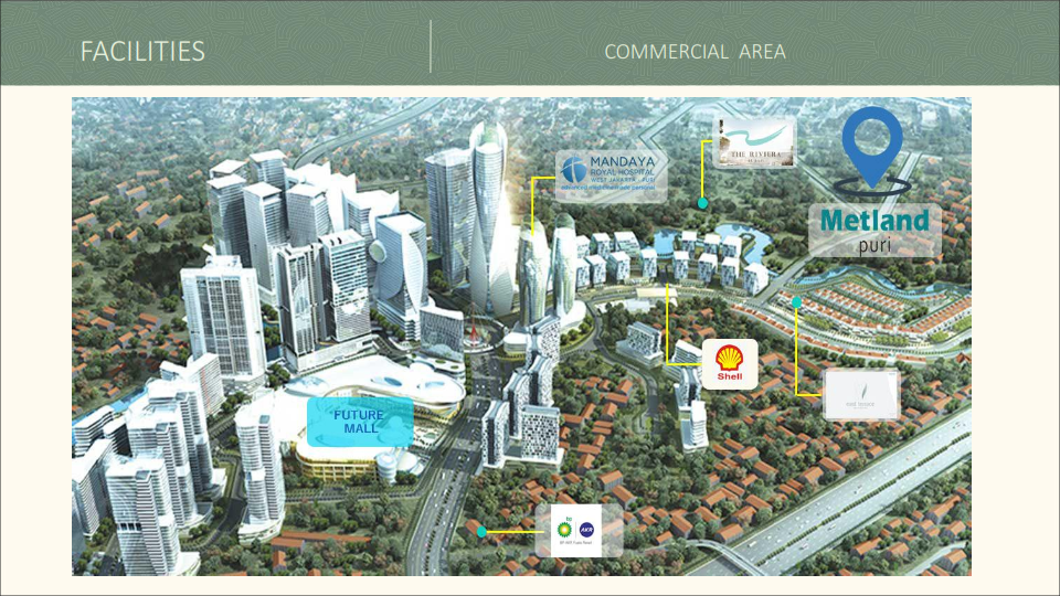 Cluster Oxalis Metland Puri dikelilingi oleh fasilitas area sekitar yang sudah lengkap dan terus berkembang dari rumah sakit, pom bensin dan akan tersedia mall di masa depan. Dilengkapi dengan fasilitas cluster yaitu Clubhouse berupa kolam berenang dan pendukung aktivitas olahraga lainnya yang dapat dinikmati bersama