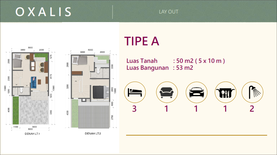 Lebar 5x10m, Luas Tanah 50 m2, Luas Bangunan 53 m2 – Bangunan 2 Lantai