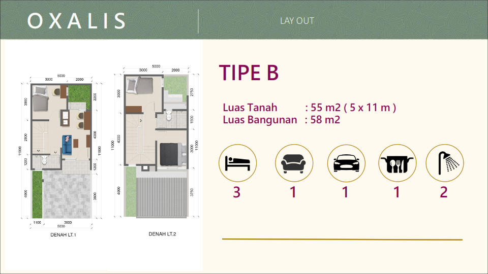 Lebar 5x11m, Luas Tanah 55 m2, Luas Bangunan 58 m2 – Bangunan 2 Lantai