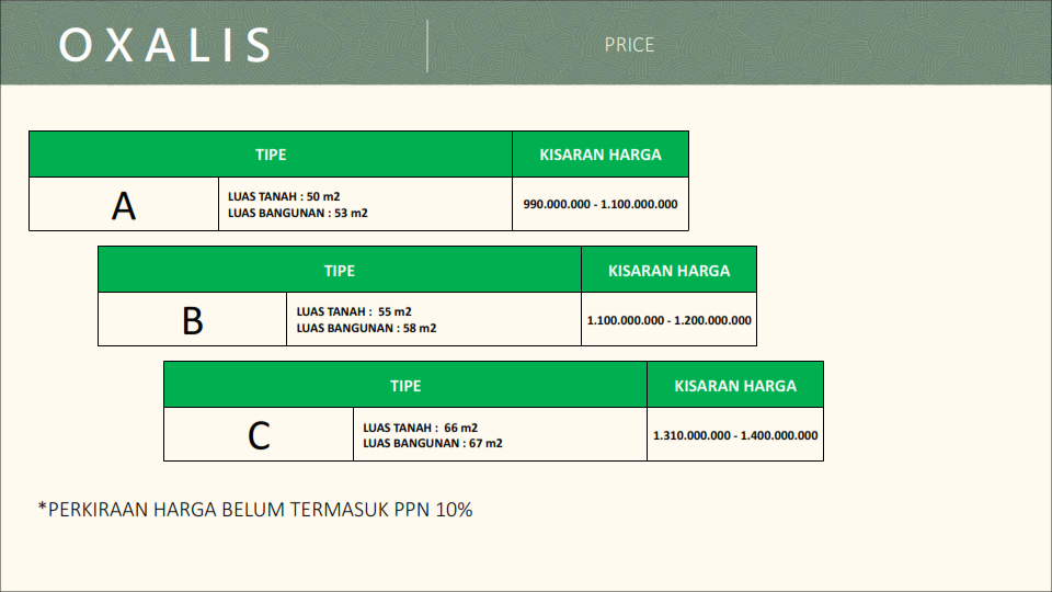 Tipe Unit dan Harga Cluster Oxalis Metland Puri