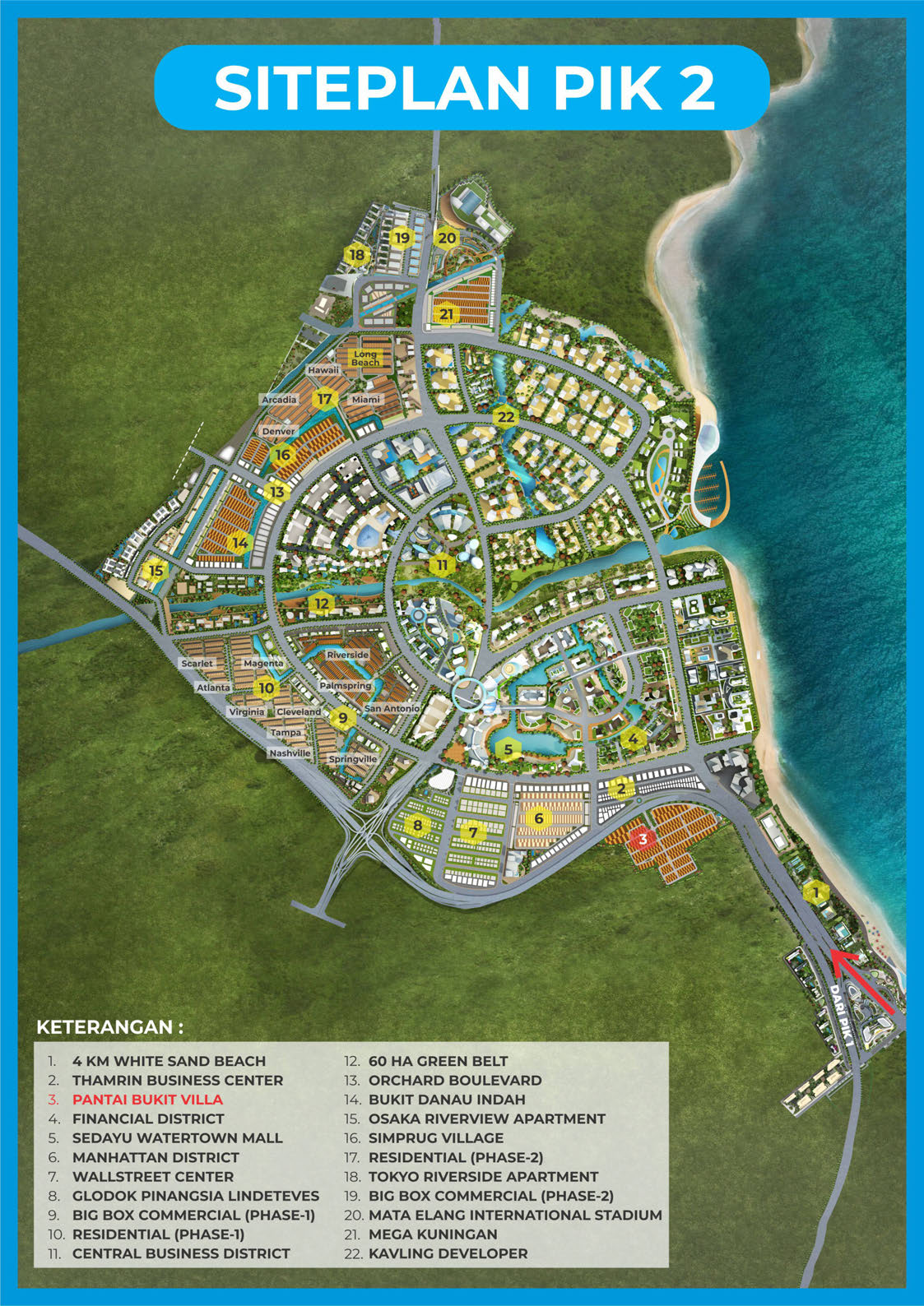 Pantai Bukit Villa merupakan produk residential yang berada di mega proyek Kota Mandiri, PIK 2. Pantai Bukit Villa berada tepat diseberang Pantai Pasir Putih sepanjang 4 KM. Akses Mudah, Lokasi yang strategis membuat setiap hari menjadi seperti suasana liburan. Selangkah menuju jembatan PIK 2 dan Gerbang Tol!