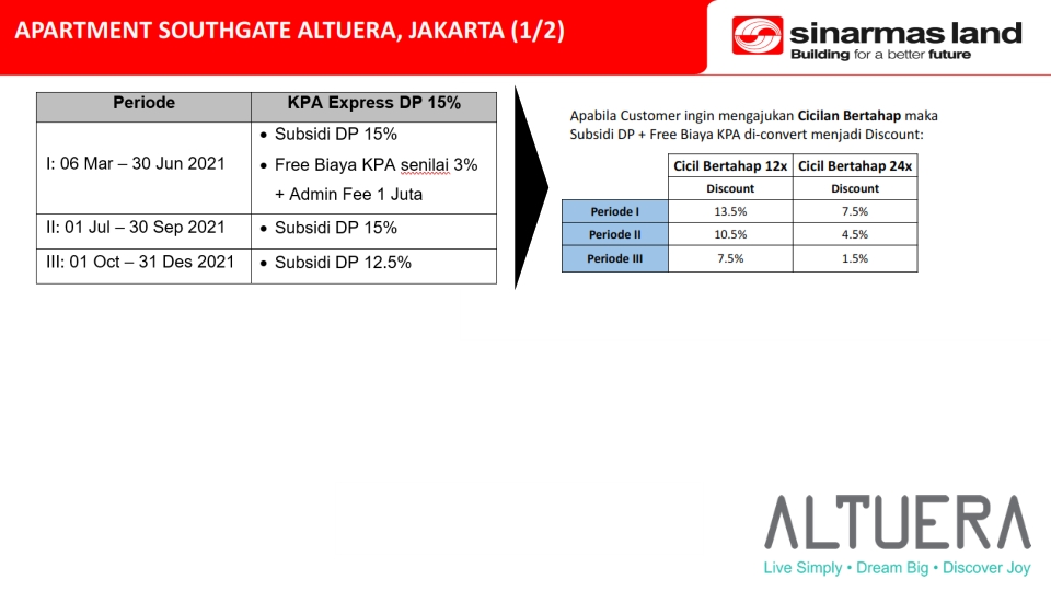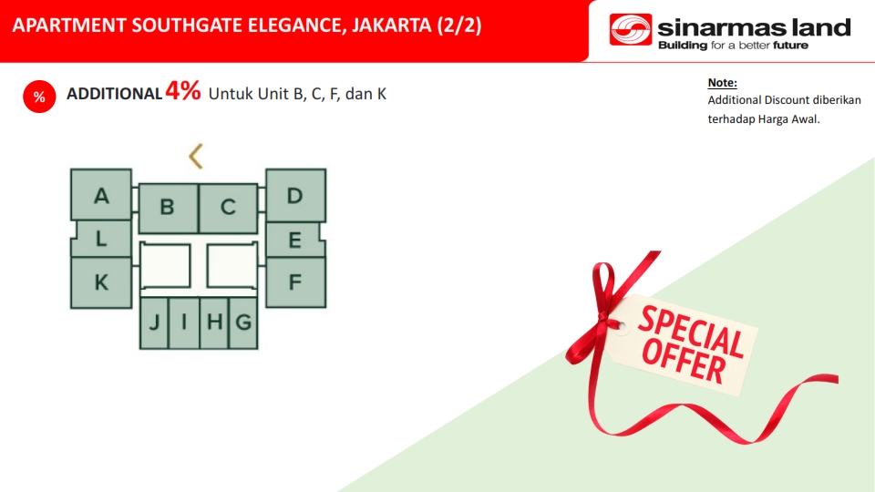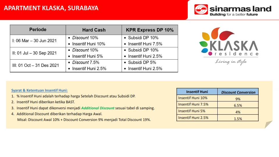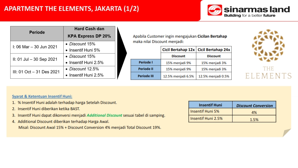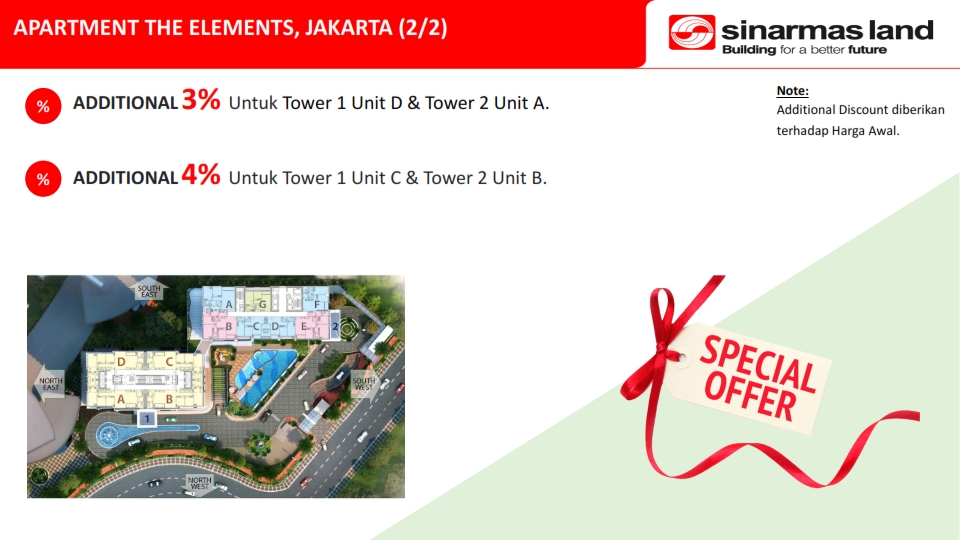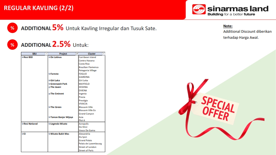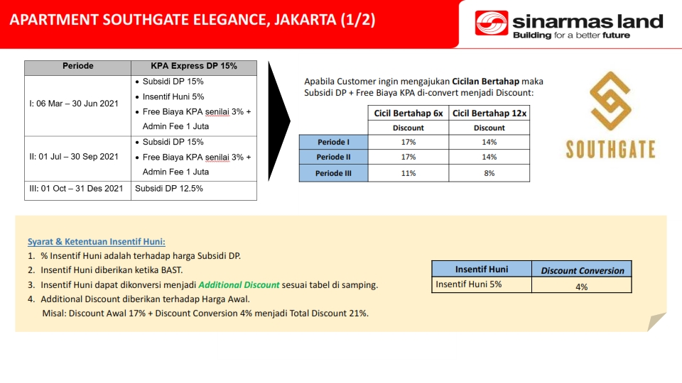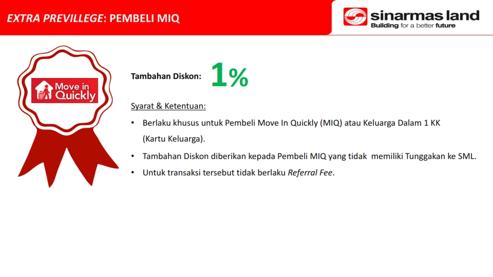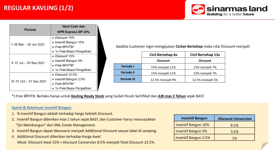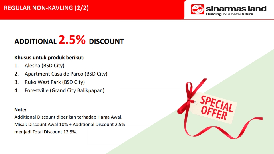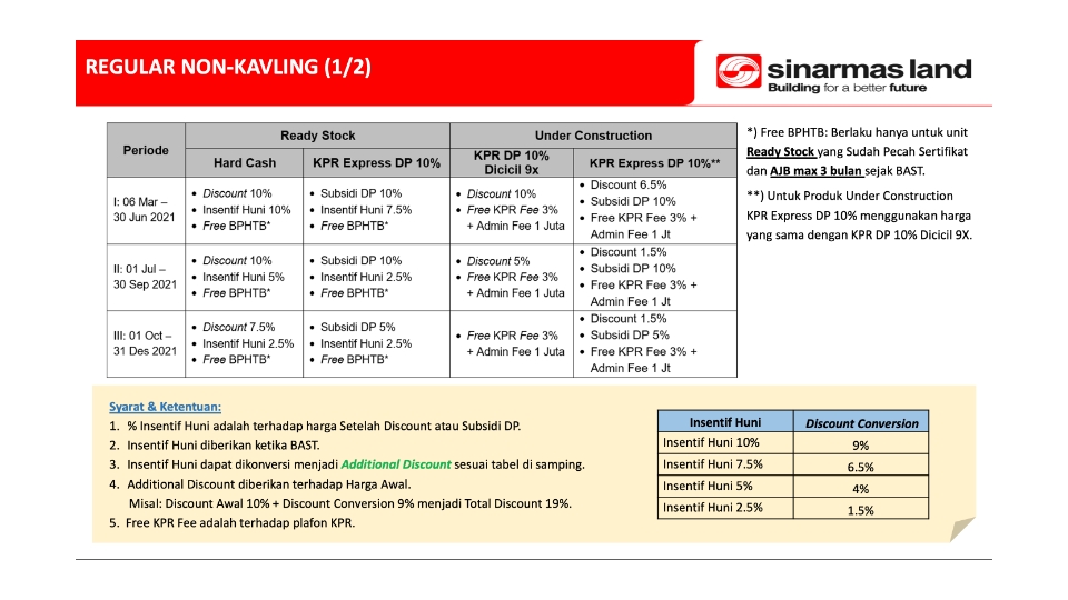 Pada awal tahun 2021 ini, Sinarmas Land memberikan penawaran menarik untuk semua properti yang dipasarkan, hal ini memudahkan kita untuk memiliki properti yaitu dengan memberikan diskon, subsidi DP bahkan Insentif Huni untuk pembelian properti . Besaran diskon hingga 10%, insentif huni 10%, ditambah free biaya akad KPR, dan lainnya.