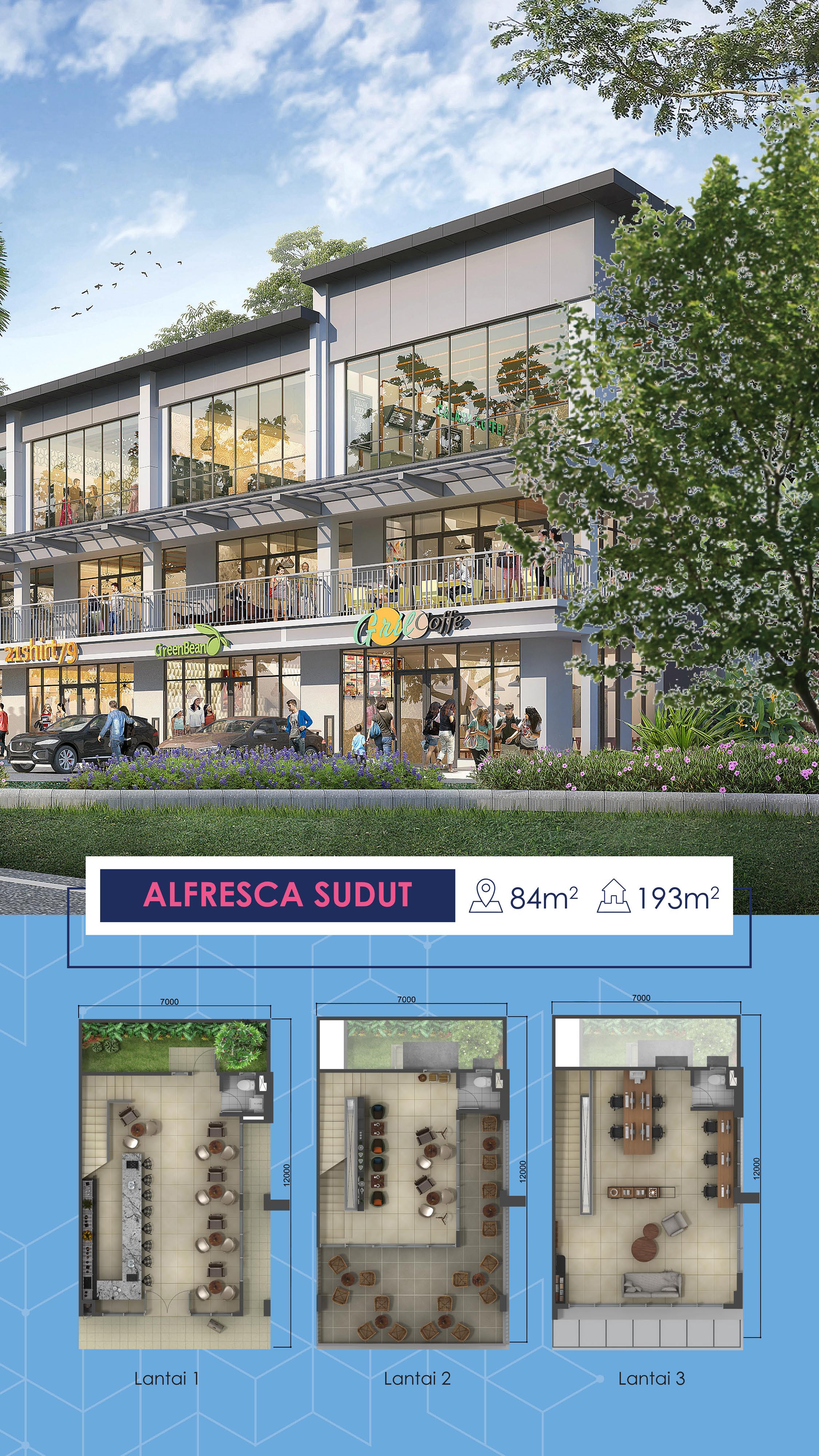 ALFRESCA SUDUT, Luas Tanah: 84m2, Luas Bangunan: 193m2.