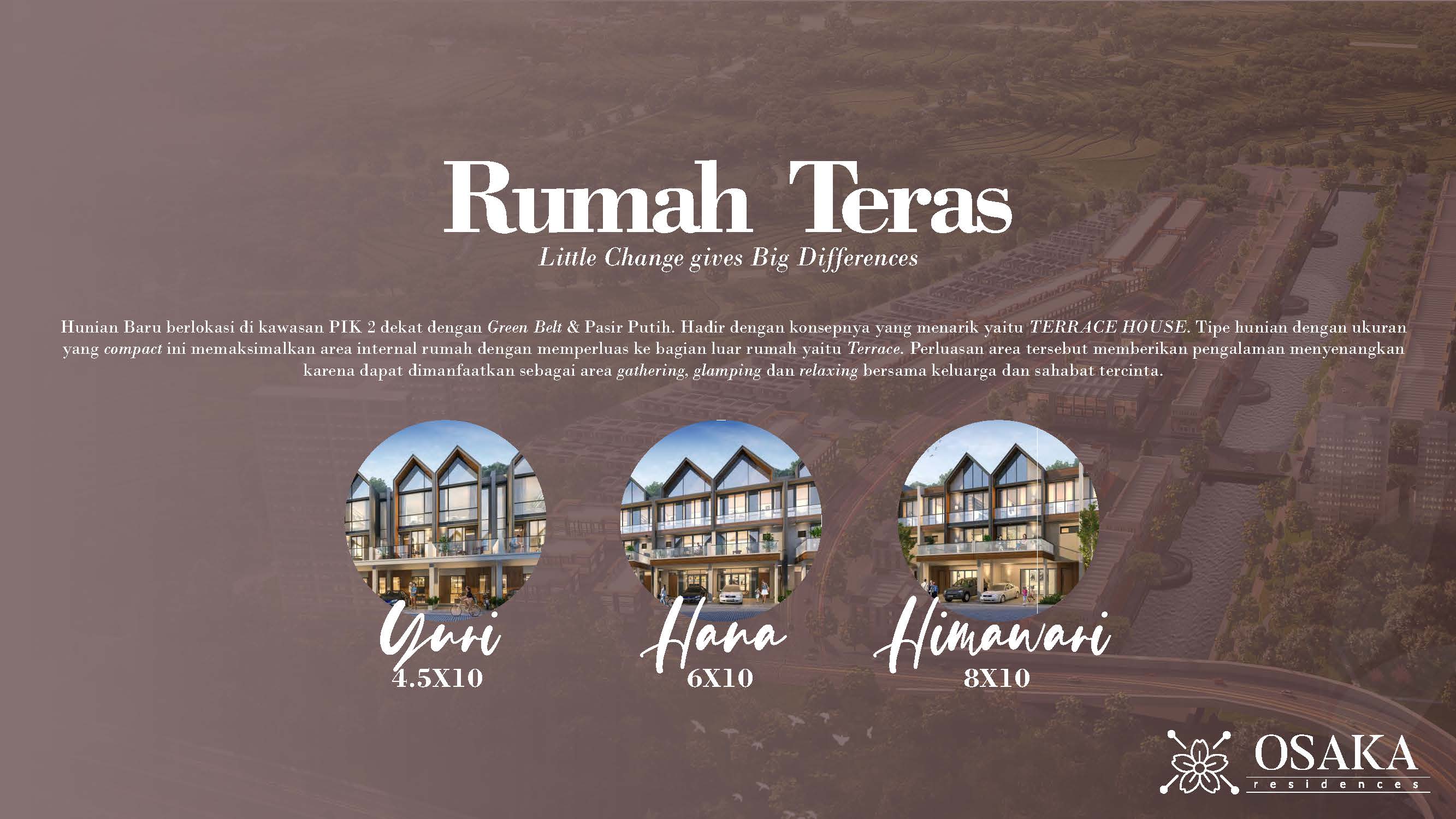 RUMAH TERAS adalah produk residential yang berada di mega proyek PIK 2. Menghadirkan hunian berkonsep Smaller Space But Bigger & More Experience. Dengan room management yang efisien dan menyenangkan, RUMAH TERAS akan memberikan pengalaman bersosial terbaik di rumah anda.