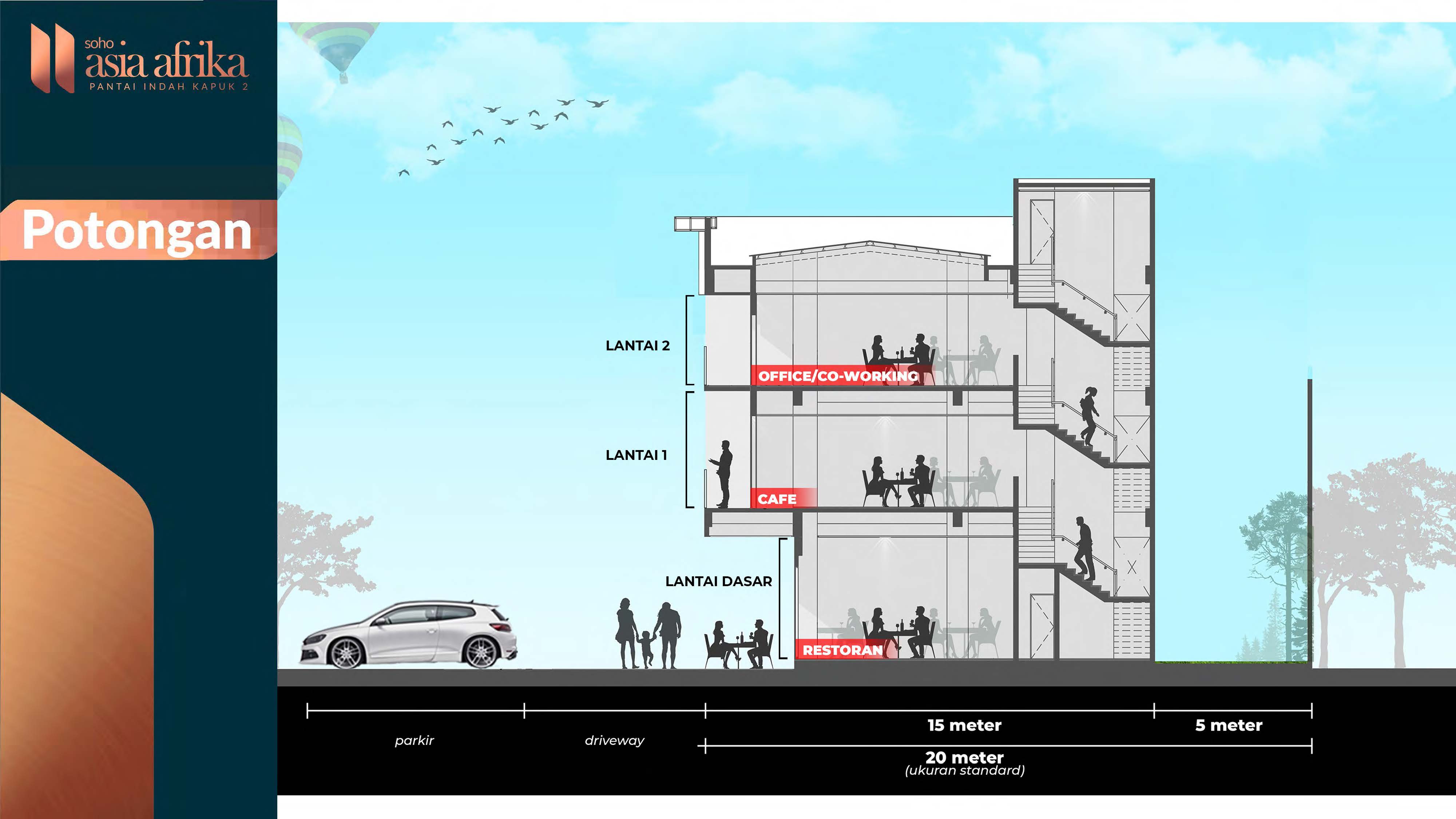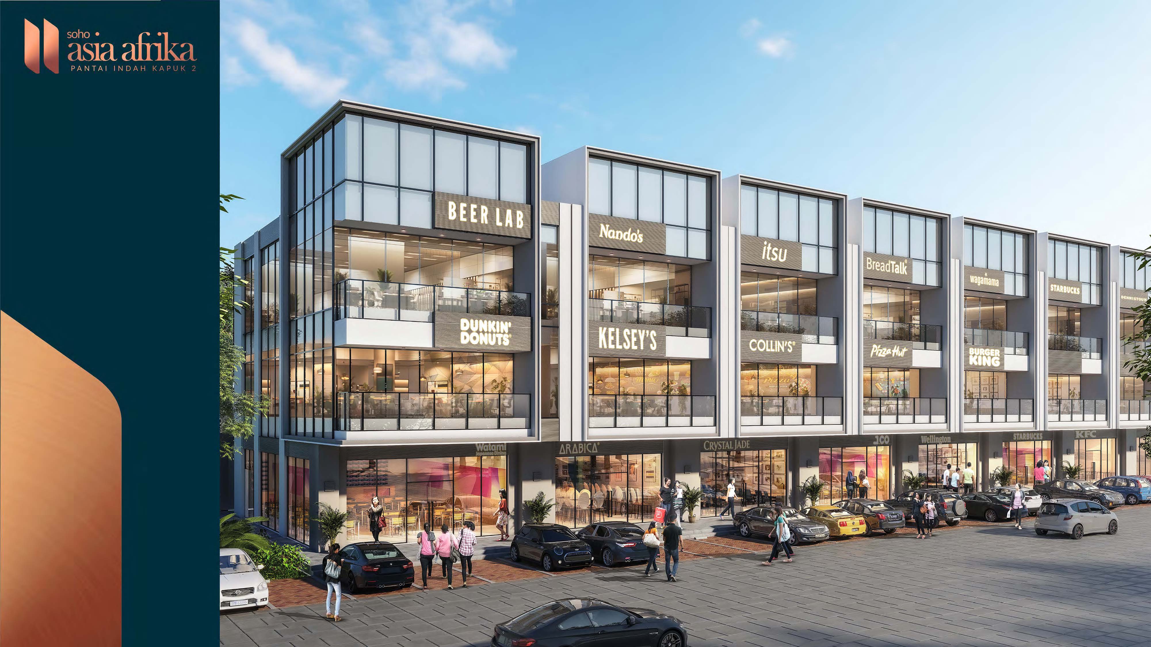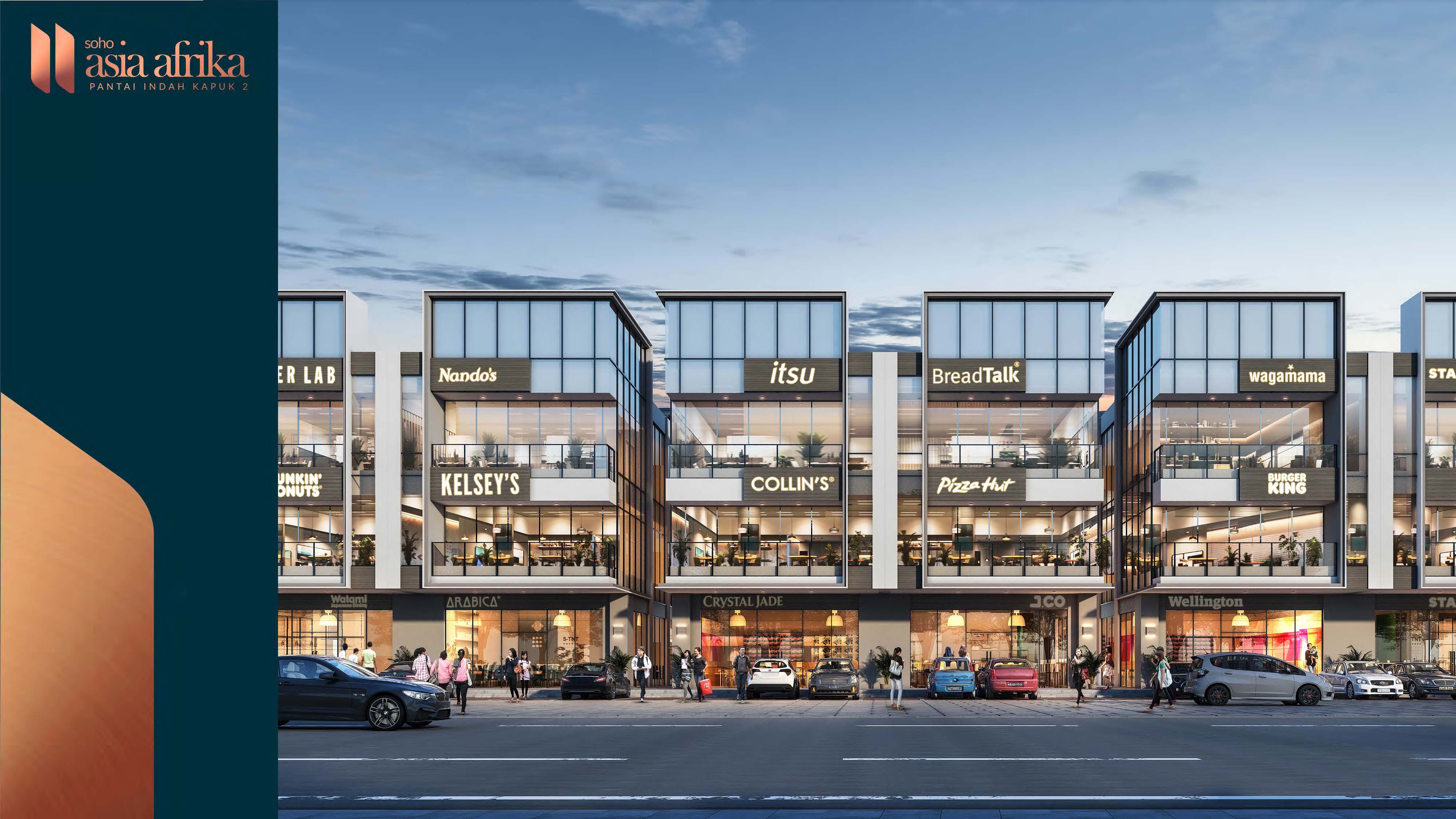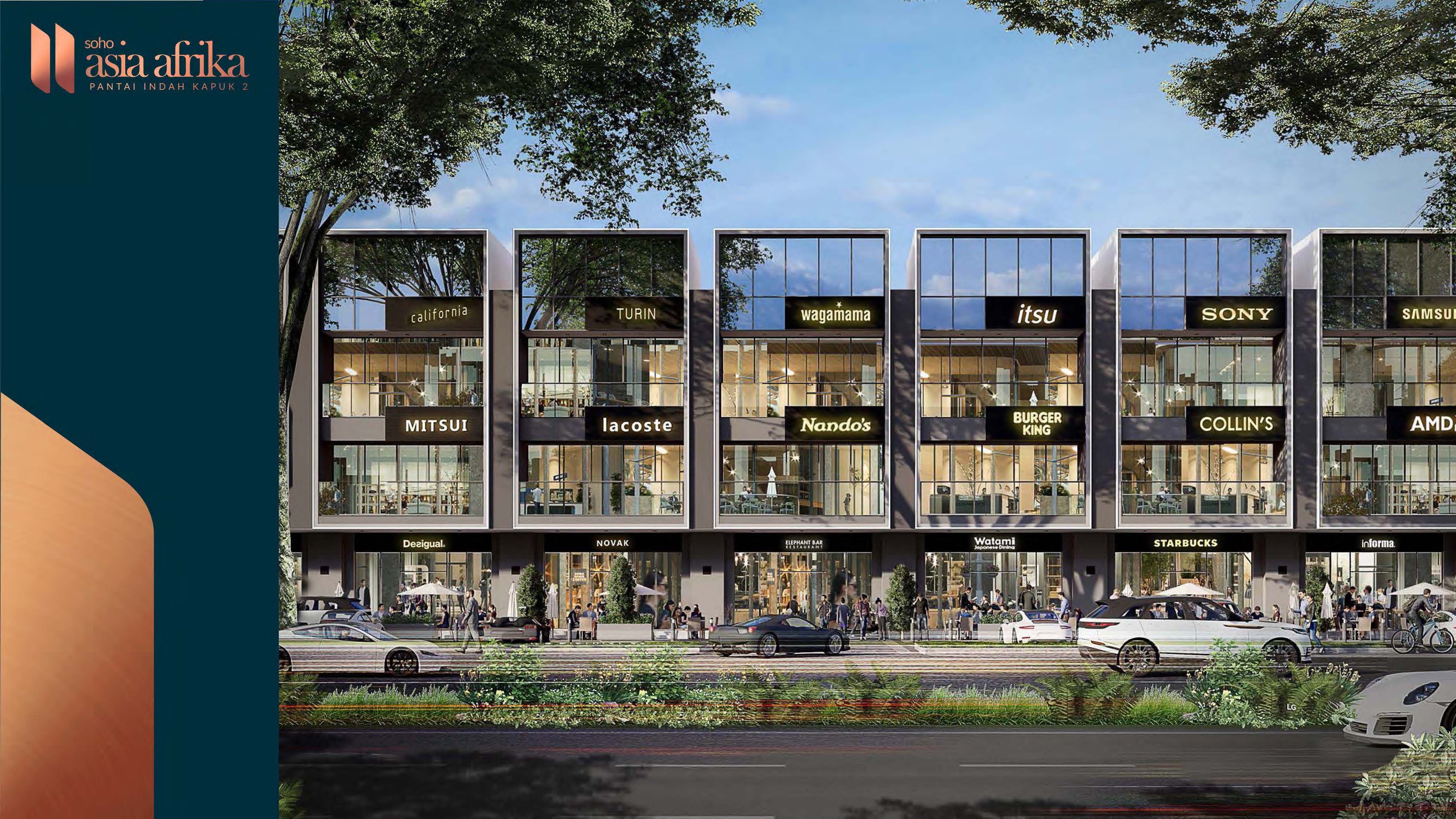 SOHO ASIA AFRIKA dikembangkan dalam megaproyek PIK 2. Terletak di Jalan Utama PIK 2, Soho Asia Afrika sangat cocok untuk anda yang ingin membuka usaha resto/cafe, bank, working space dan lain-lain.