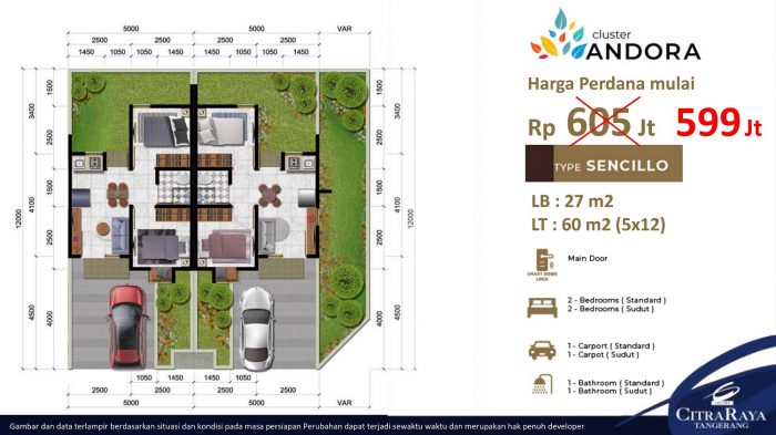 1. Type Sencillo, LB. 27 m2 / LT 60 m2 (5m x 12m), KT: 2 , KM: 1, Harga Mulai 599 Juta