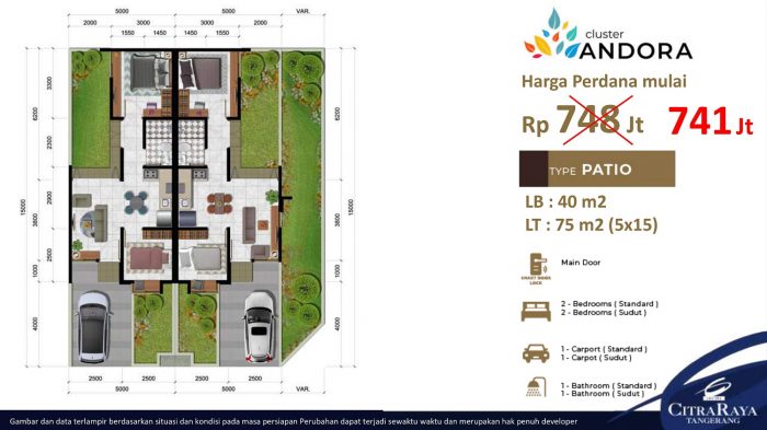 2. Type Patio, LB 40m2 / LT. 75m2 (5m x 15m) KT: 2, KM: 1, Harga Mulai 741 juta