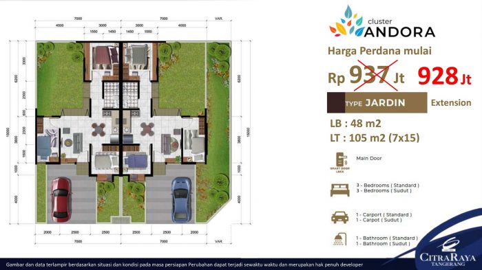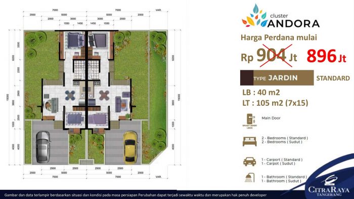 3. Type Jardin Standard, LB. 40 m2 / LT. 105 m2 (7m x 15m), KT: 2, KM: 1, Harga Mulai 896 juta