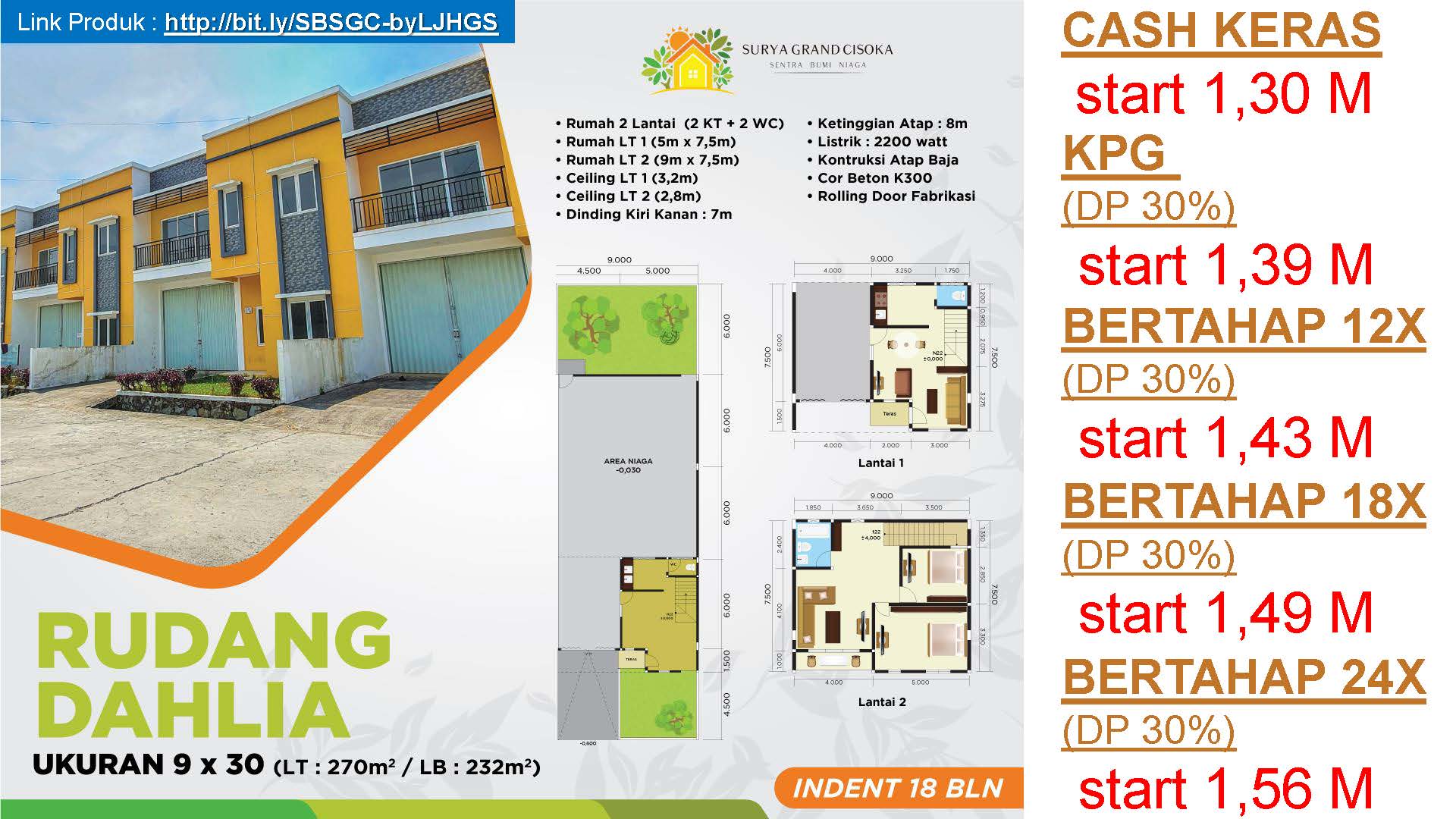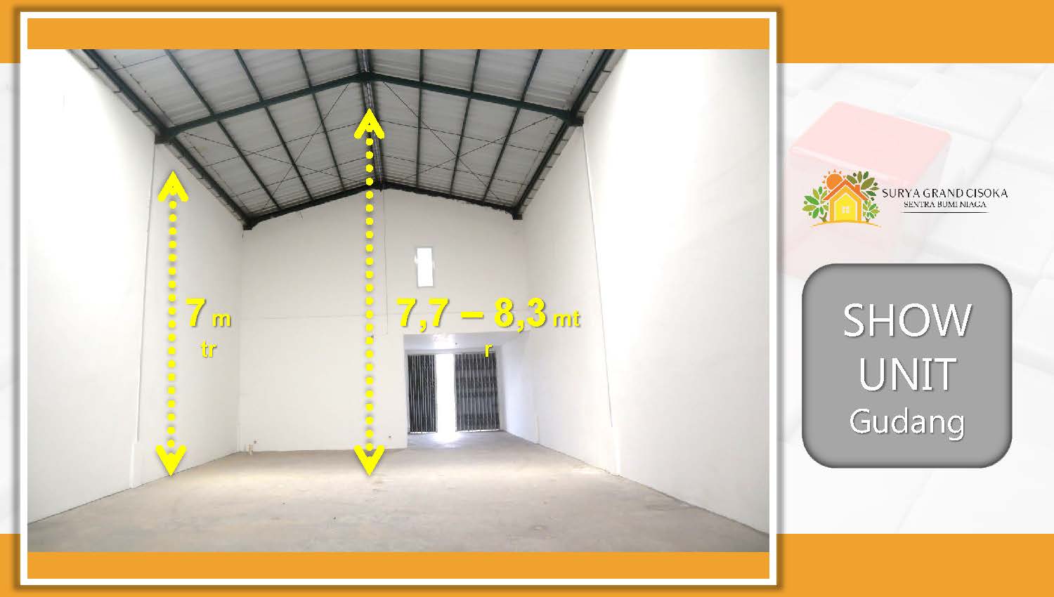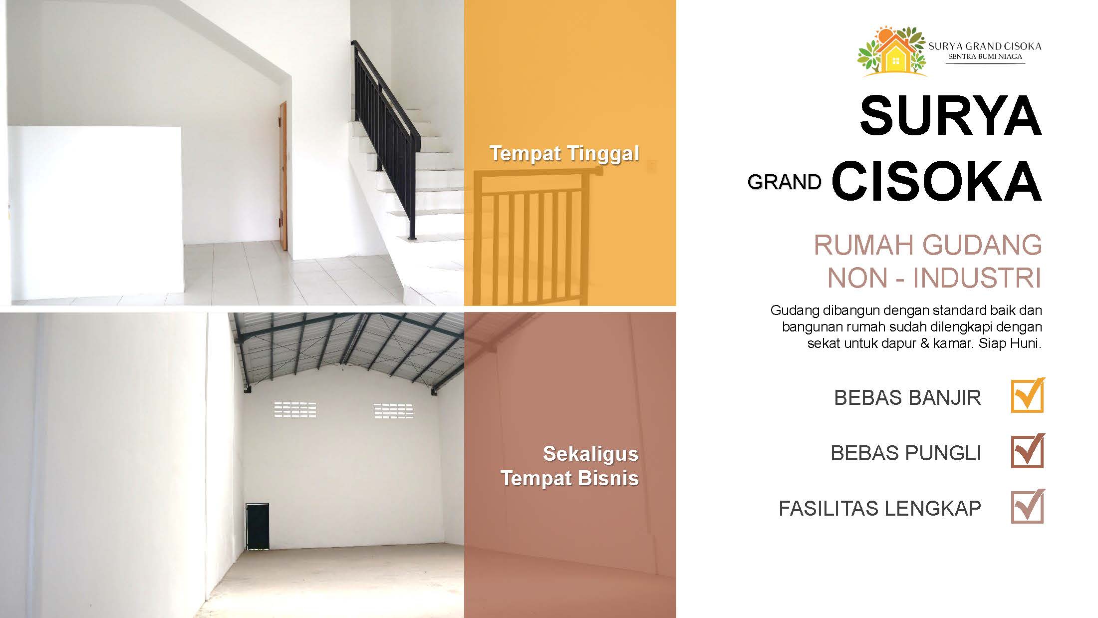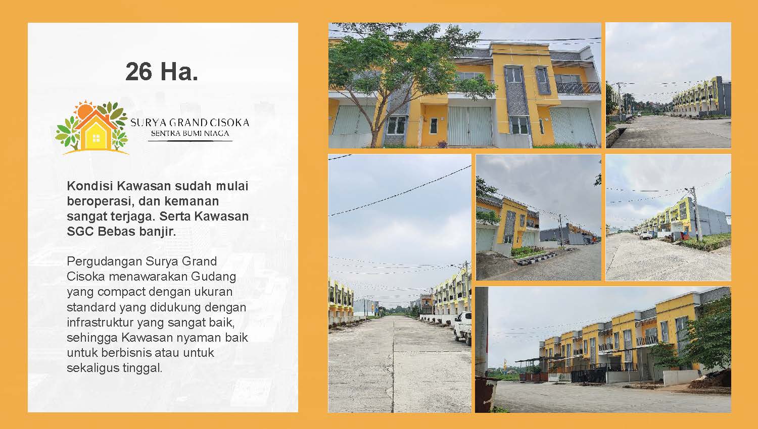 PrimaryProperty.co.id – Surya Grand Cisoka menawarkan sebuah konsep Rumah + Gudang(RUDANG) yang dilengkapi 2 lantai untuk rumah. Memiliki fasilitas lengkap, keamanan 24 jam, bebas pungli dan kawasan bebas banjir. SGC juga akan menghadirkan banyak fasilitas yang dapat digunakan penghuni.