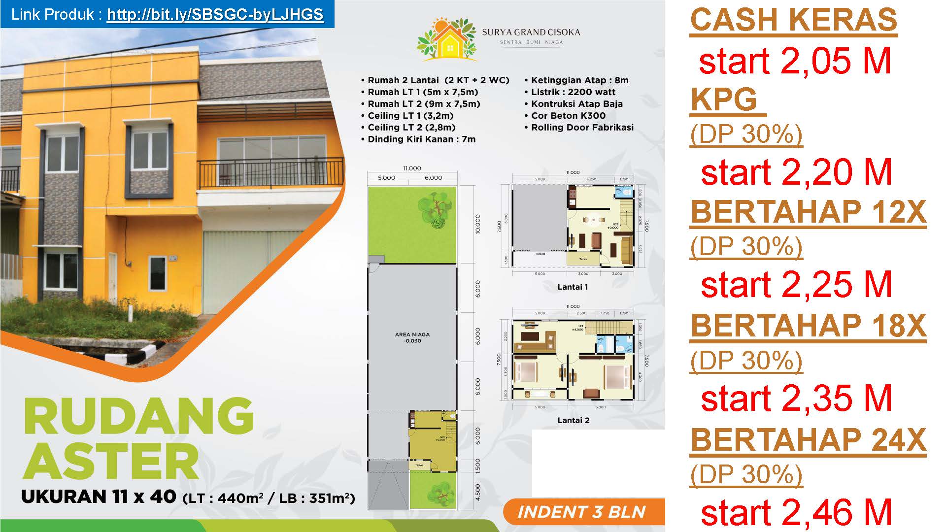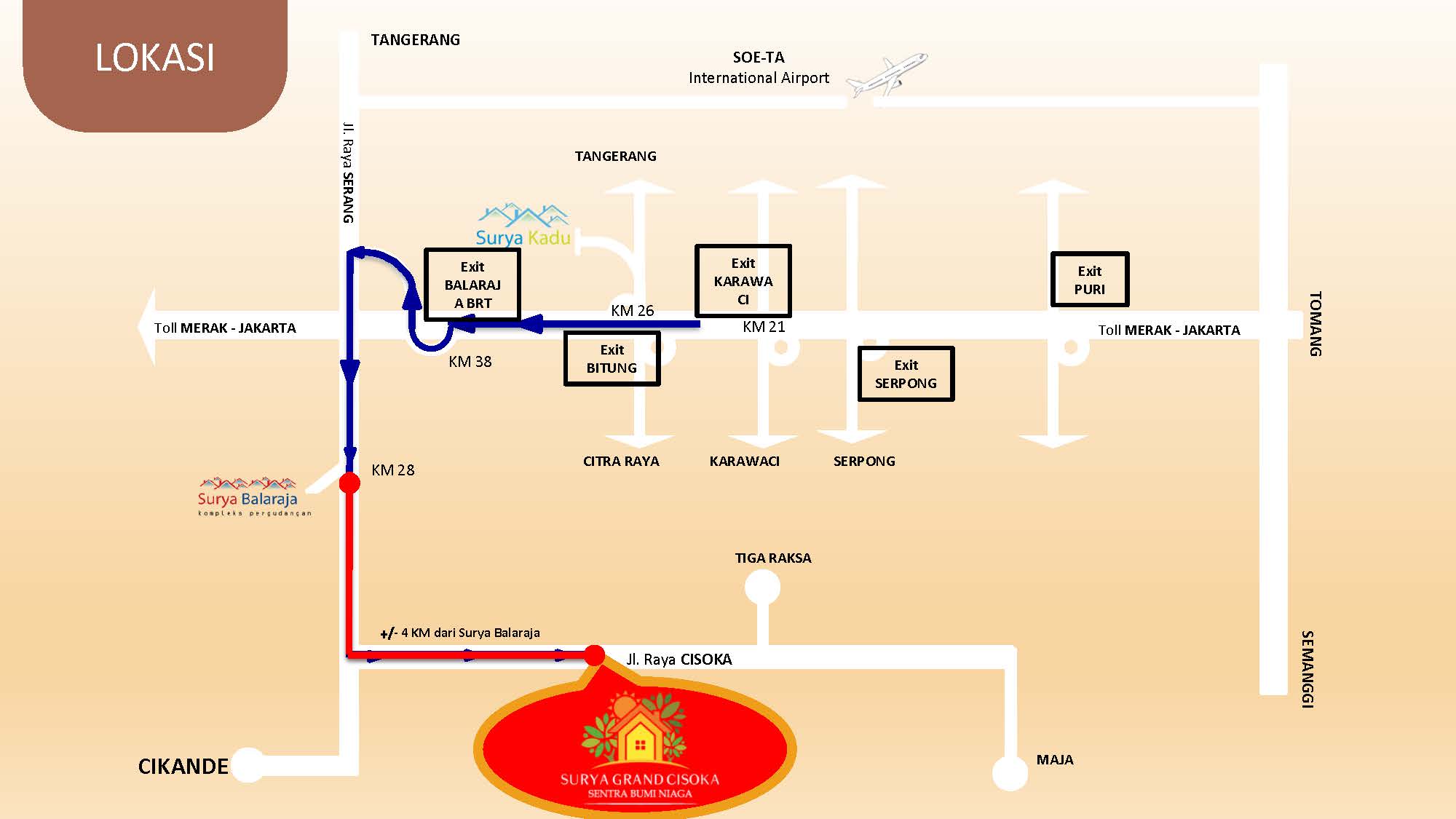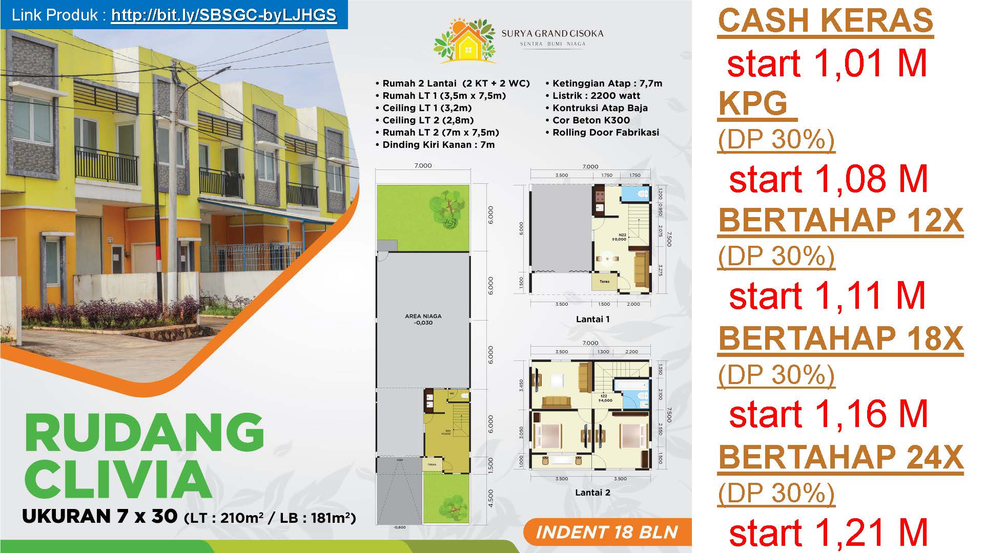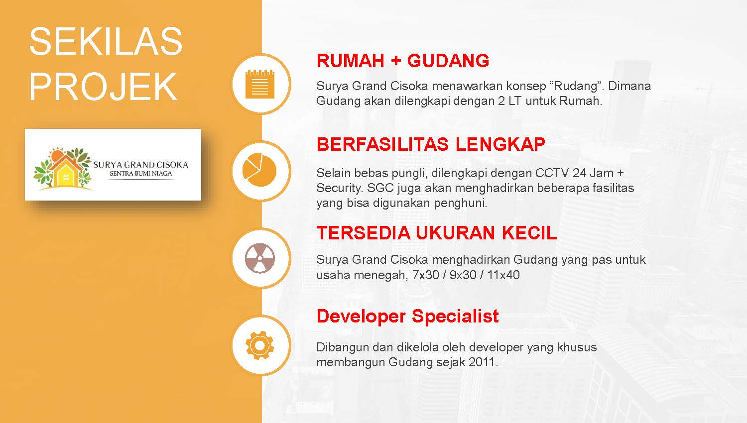 PrimaryProperty.co.id – Surya Grand Cisoka menawarkan sebuah konsep Rumah + Gudang(RUDANG) yang dilengkapi 2 lantai untuk rumah. Memiliki fasilitas lengkap, keamanan 24 jam, bebas pungli dan kawasan bebas banjir. SGC juga akan menghadirkan banyak fasilitas yang dapat digunakan penghuni.