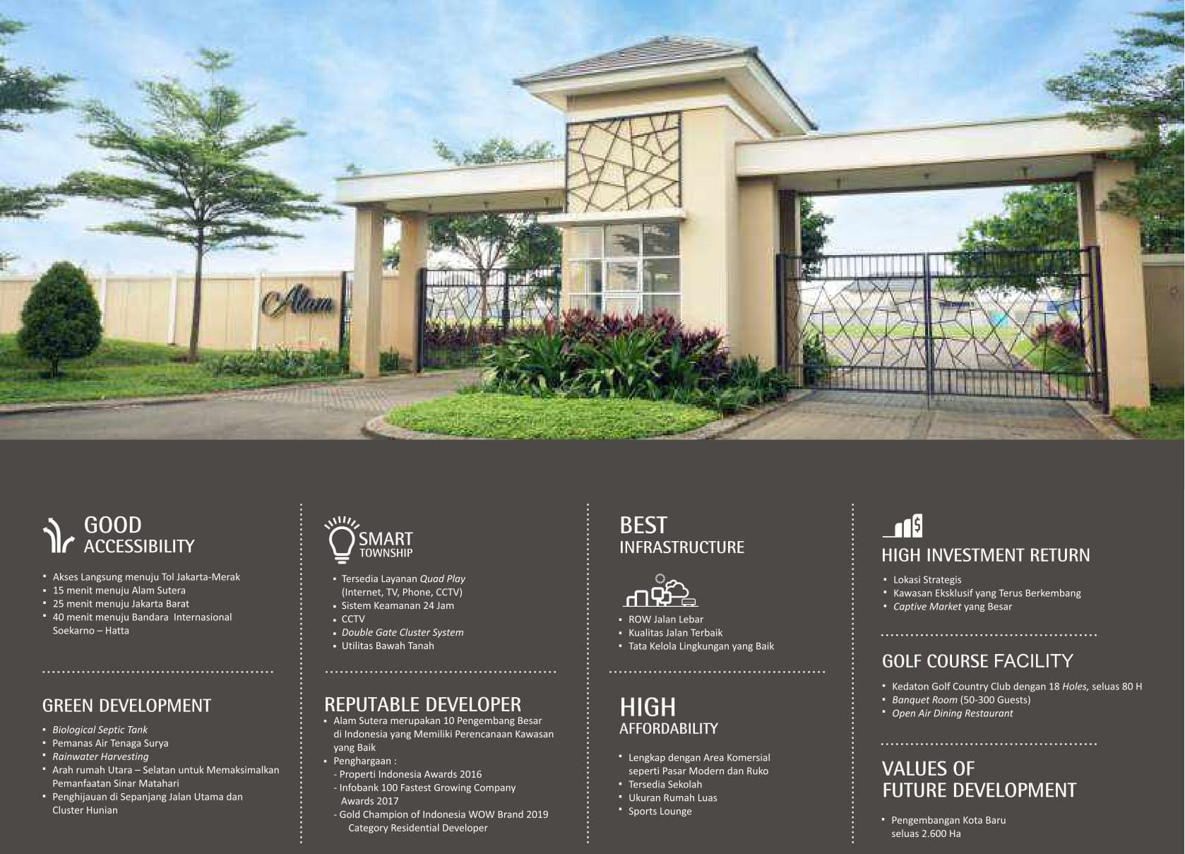 Klaster Alam, merupakan klaster pertama di superklaster Jati yang kini telah dihuni, terletak berdampingan dengan area Ruko Terrace 8 dan Terrace 9, Sekolah Laurensia dan Pasar Modern yang akan memudahkan aktifitas untuk memenuhi kebutuhan sehari-hari Keluarga Anda.