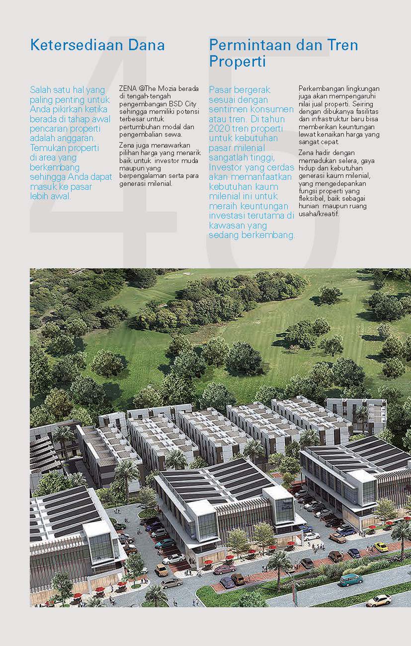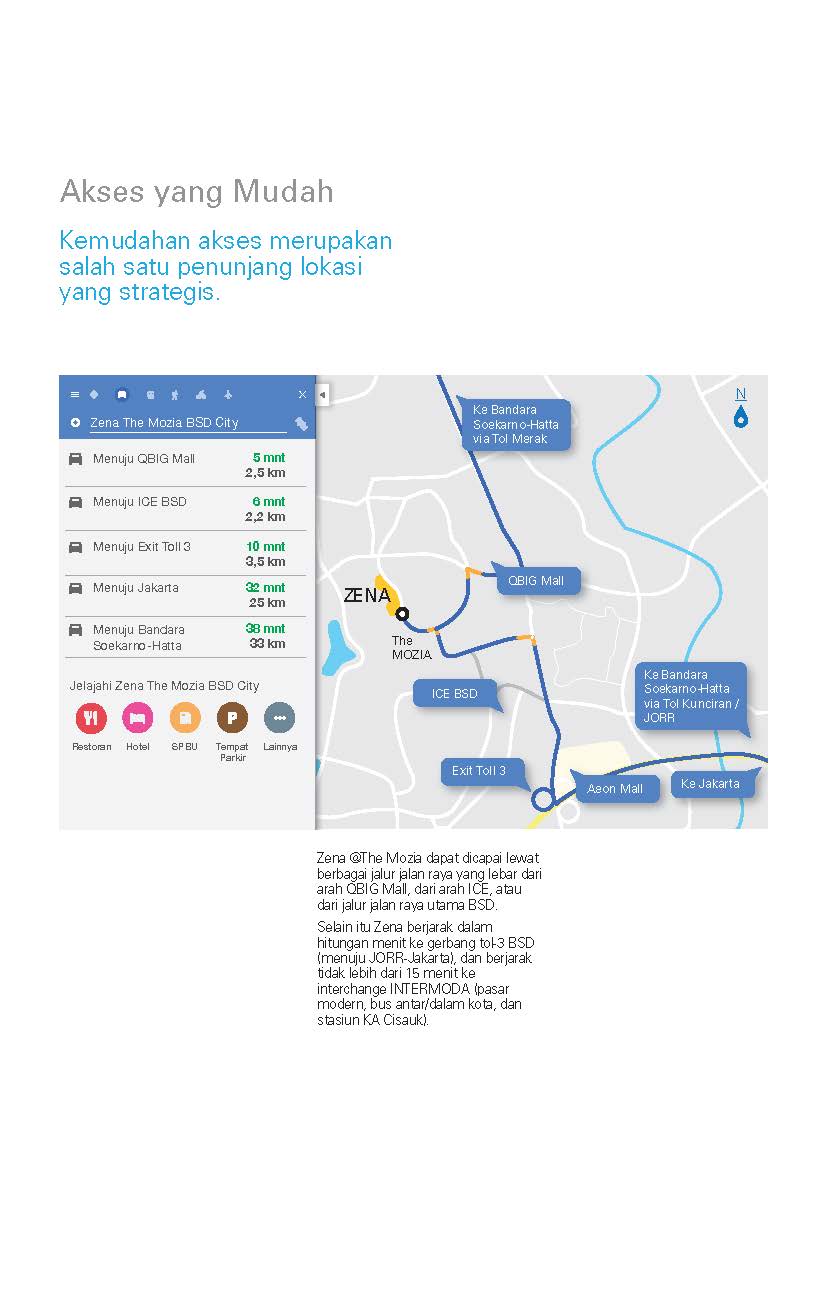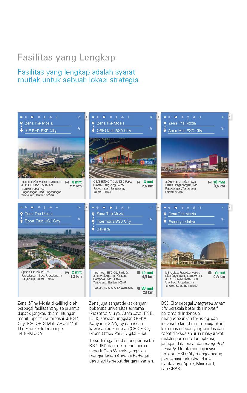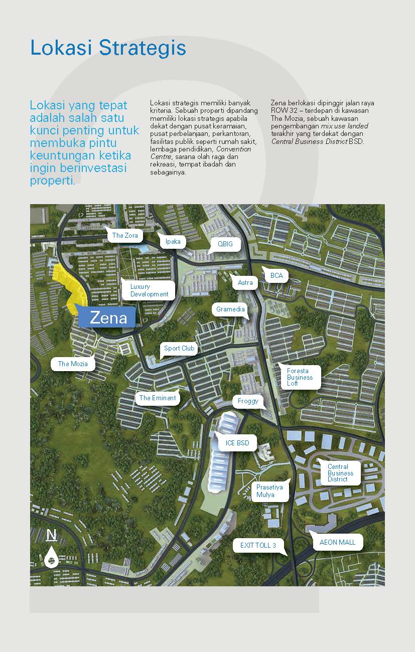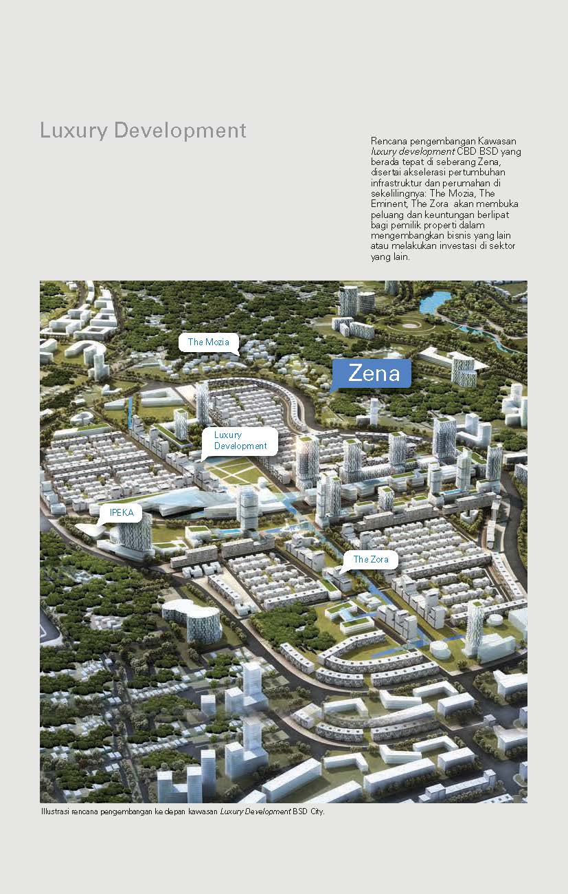 Zena berada di BSD City hasil pengembangan developer ternama, Sinarmas Land. Berlokasi dipinggir jalan raya ROW 32 – terdepan di kawasan The Mozia, sebuah kawasan pengembangan mix use landed terakhir yang terdekat dengan Central Business District BSD.